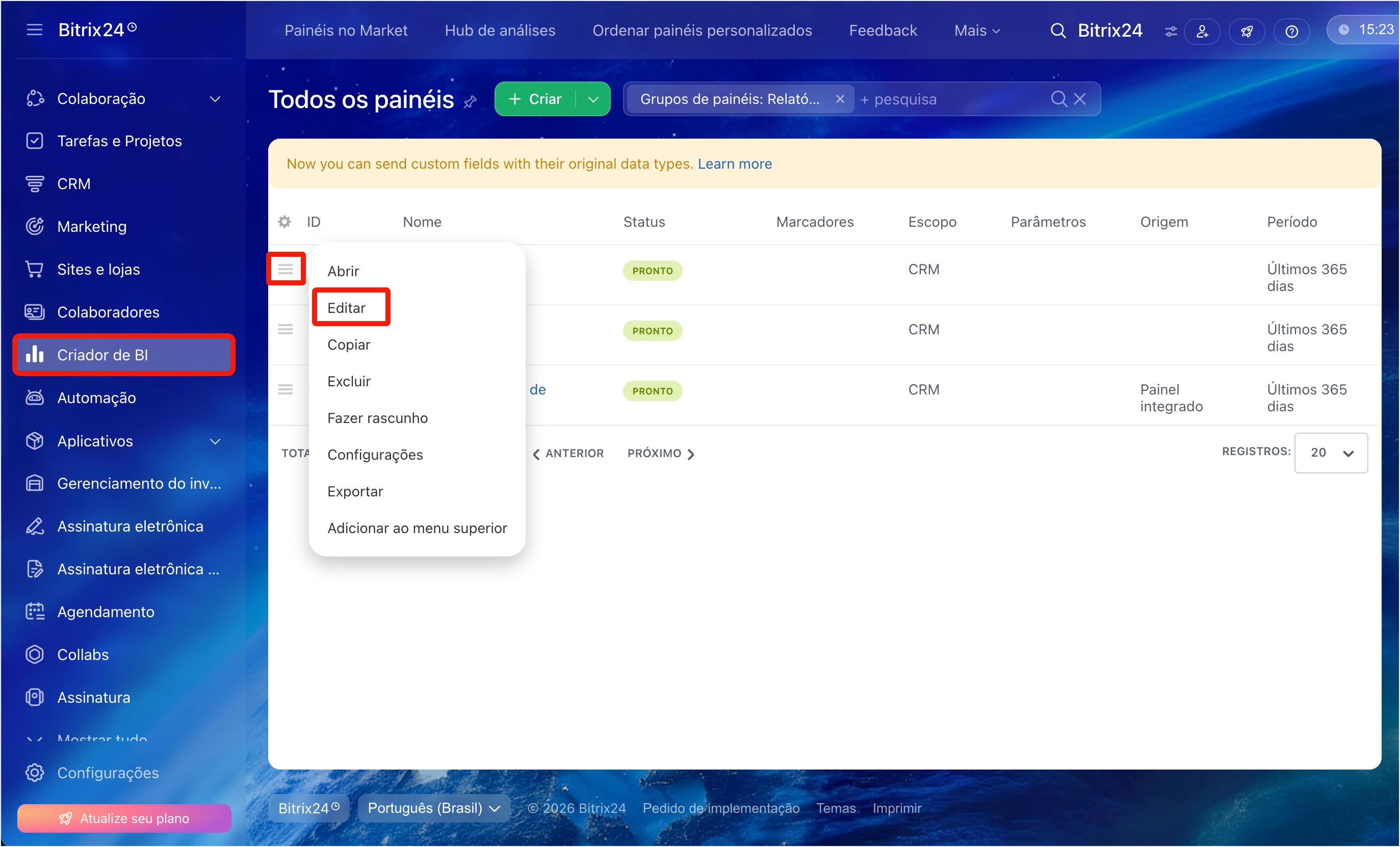 - Você pode personalizar o relatório na seção CRM > Criador de BI > Meus Relatórios. Selecione um relatório e clique em Editar.