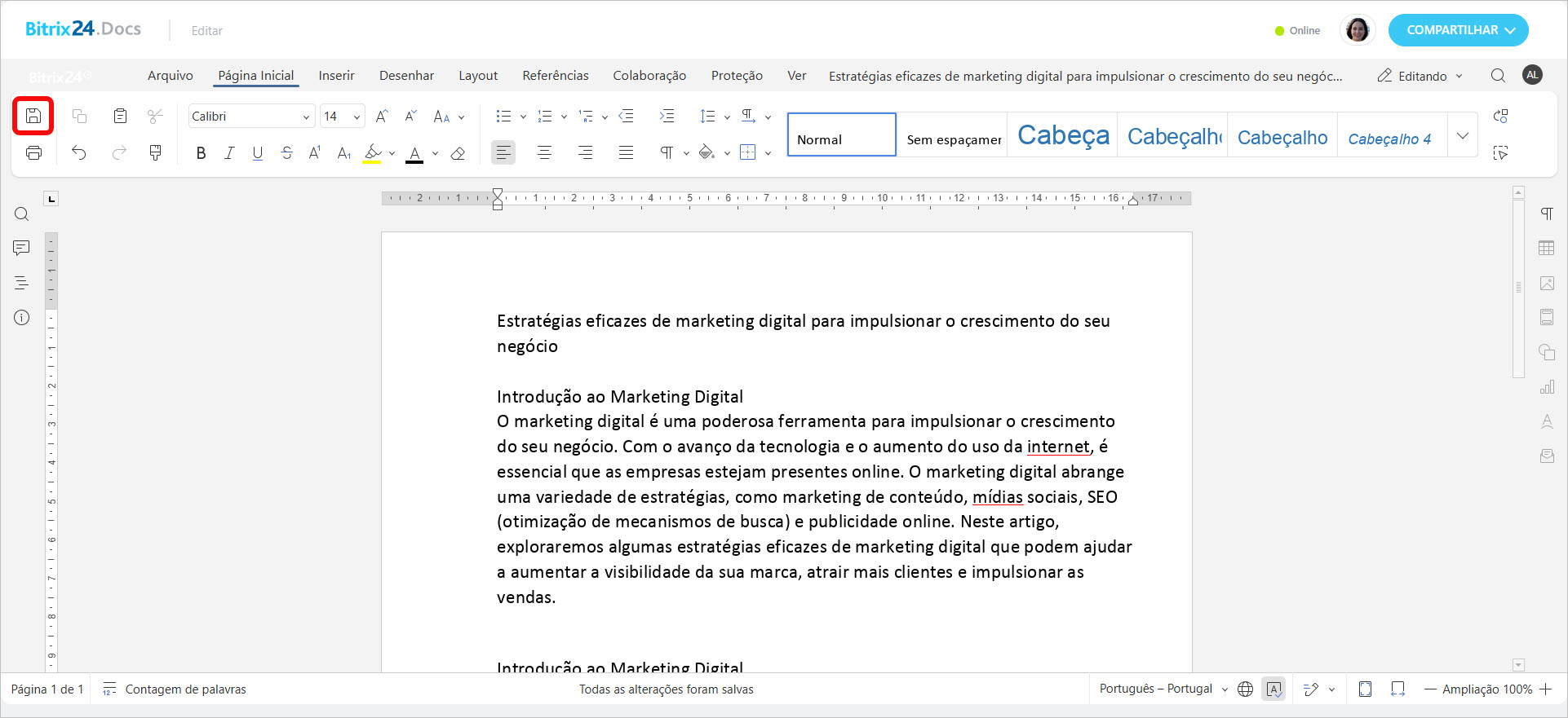 Para salvar um documento, clique no botão Salvar ou simplesmente feche-o. As alterações no Bitrix24.Docs são salvas automaticamente.