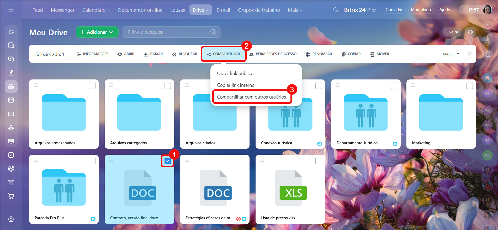 1–3. Selecione o documento desejado e clique em Compartilhar > Compartilhar com outros usuáeios.