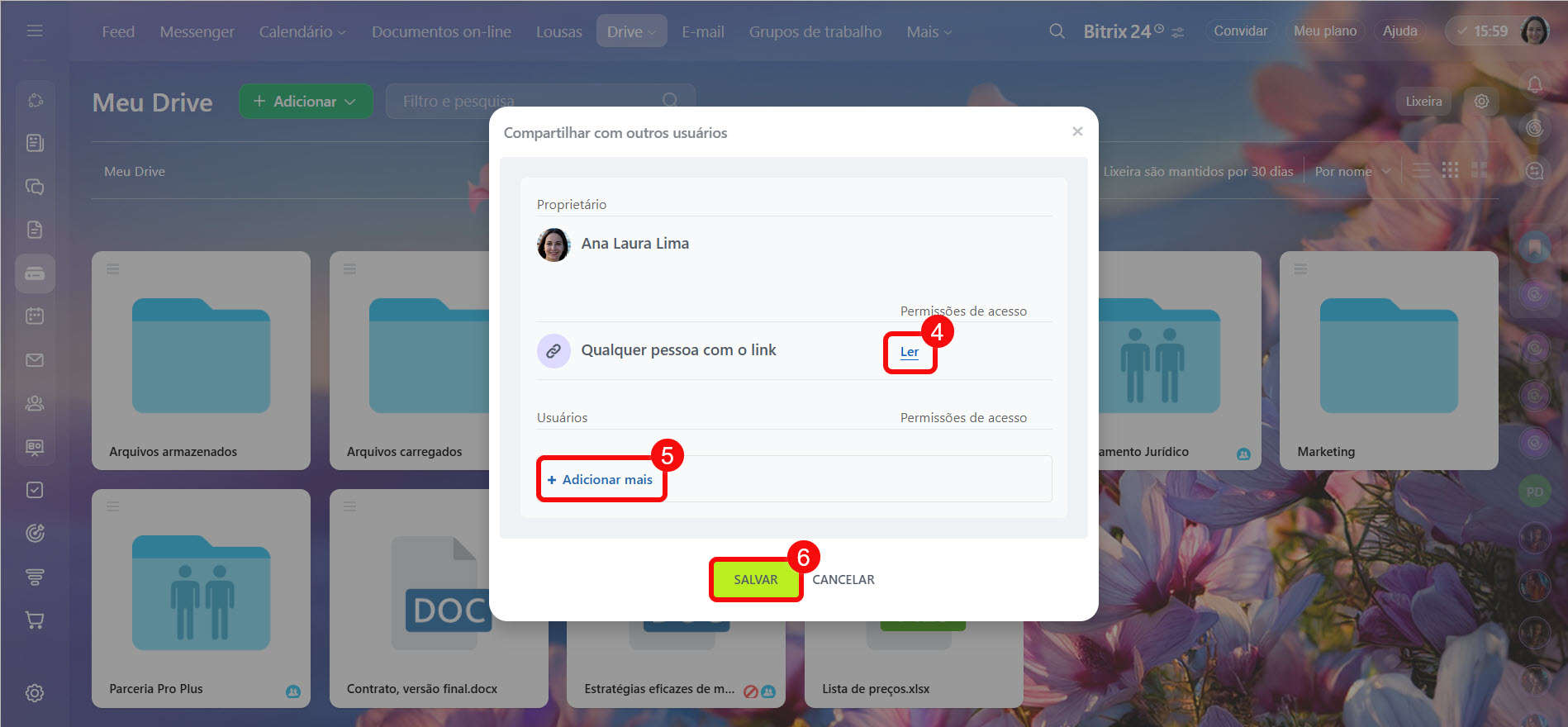 No Bitrix24, você pode trabalhar em um documento de forma colaborativa com colegas ou usuários externos. Para manter as informações sob controle, configure diferentes níveis de acesso para os participantes. Por exemplo, permita que os colaboradores editem os documentos, enquanto clientes e especialistas externos possam apenas visualizá-los.