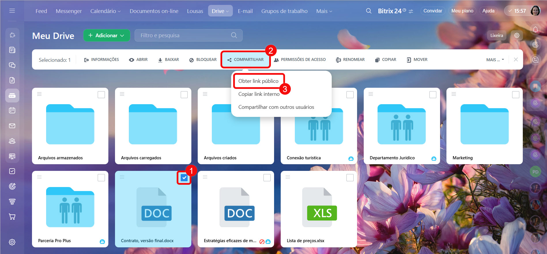 1–3. Selecione o documento desejado e clique em Compartilhar > Obter link público.