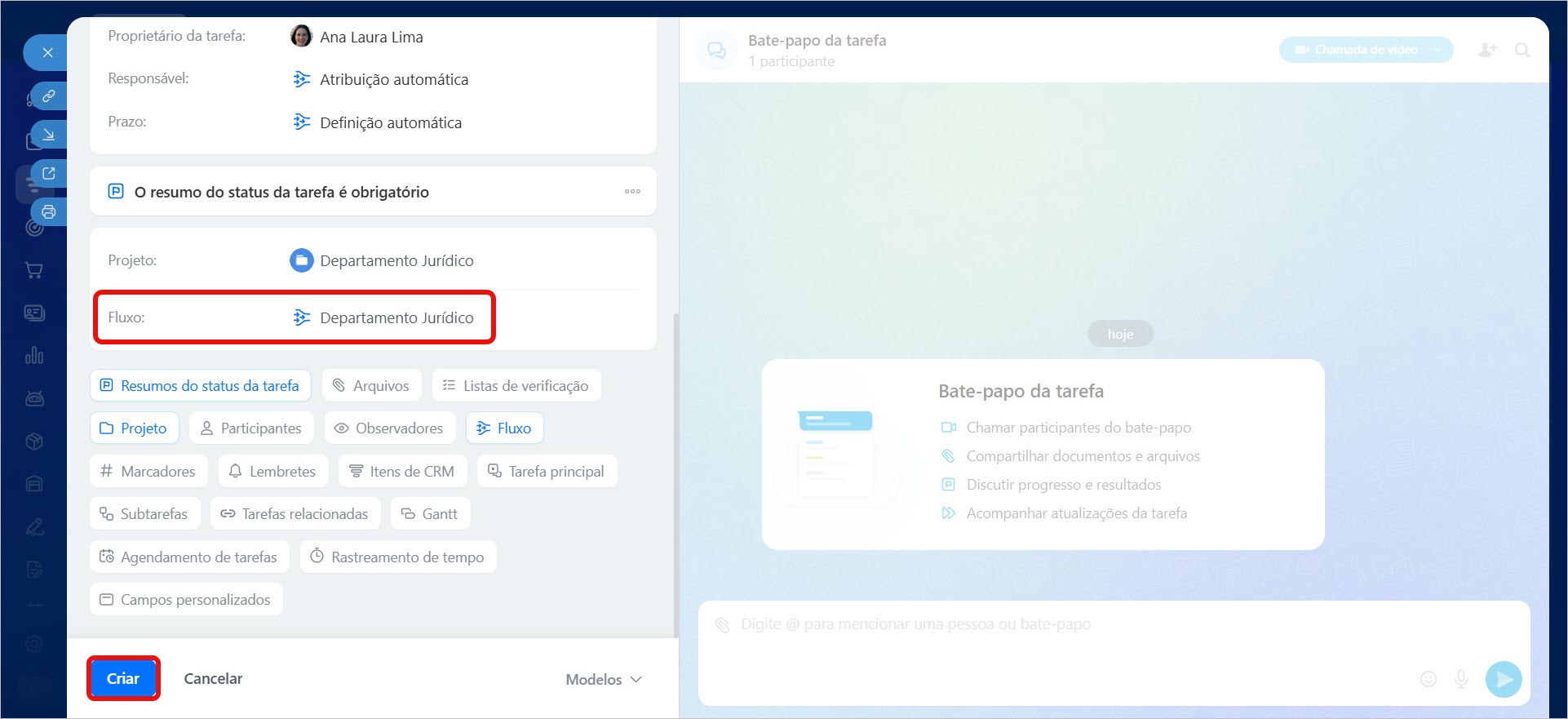 Insira o nome e a descrição da tarefa, defina configurações adicionais, como lembretes, rastreamento de tempo, etc. O responsável, o prazo da tarefa e o projeto serão atribuídos automaticamente. Clique em Criar.