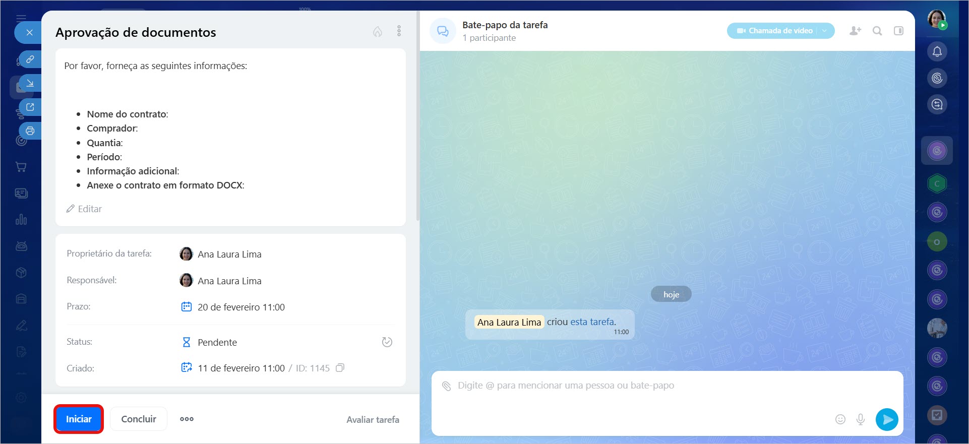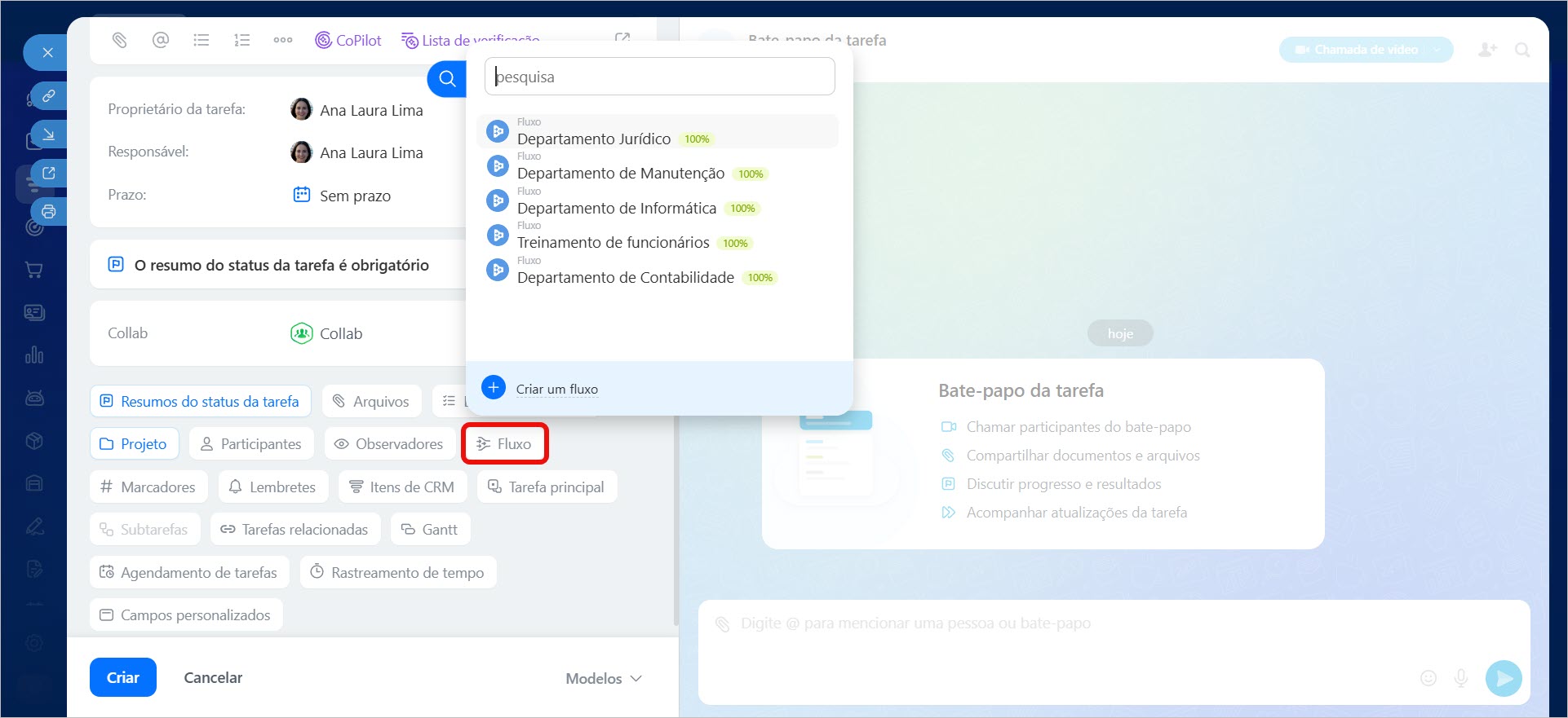 Em outras ferramentas do Bitrix24. Por exemplo, para criar uma tarefa a partir de uma mensagem de bate-papo, clique em Criar tarefa e selecione o fluxo.