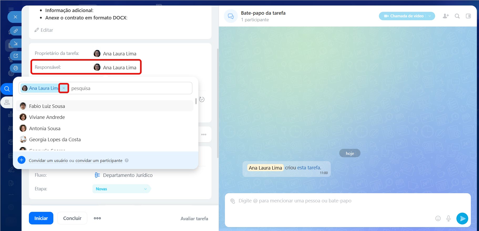 - Especifique a nova pessoa responsável pelas tarefas.