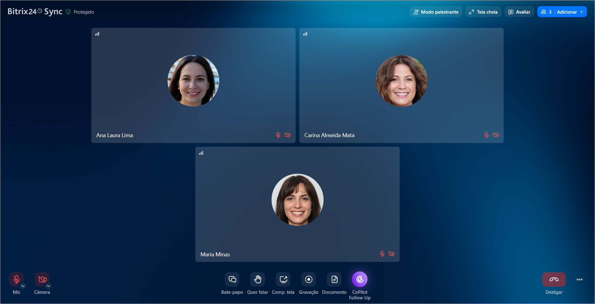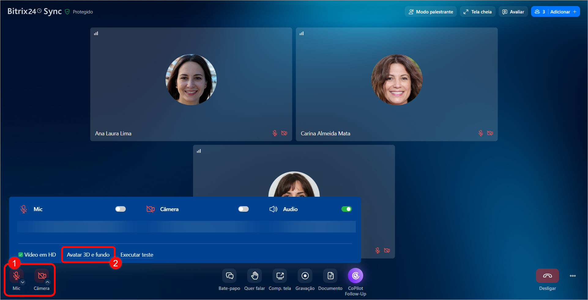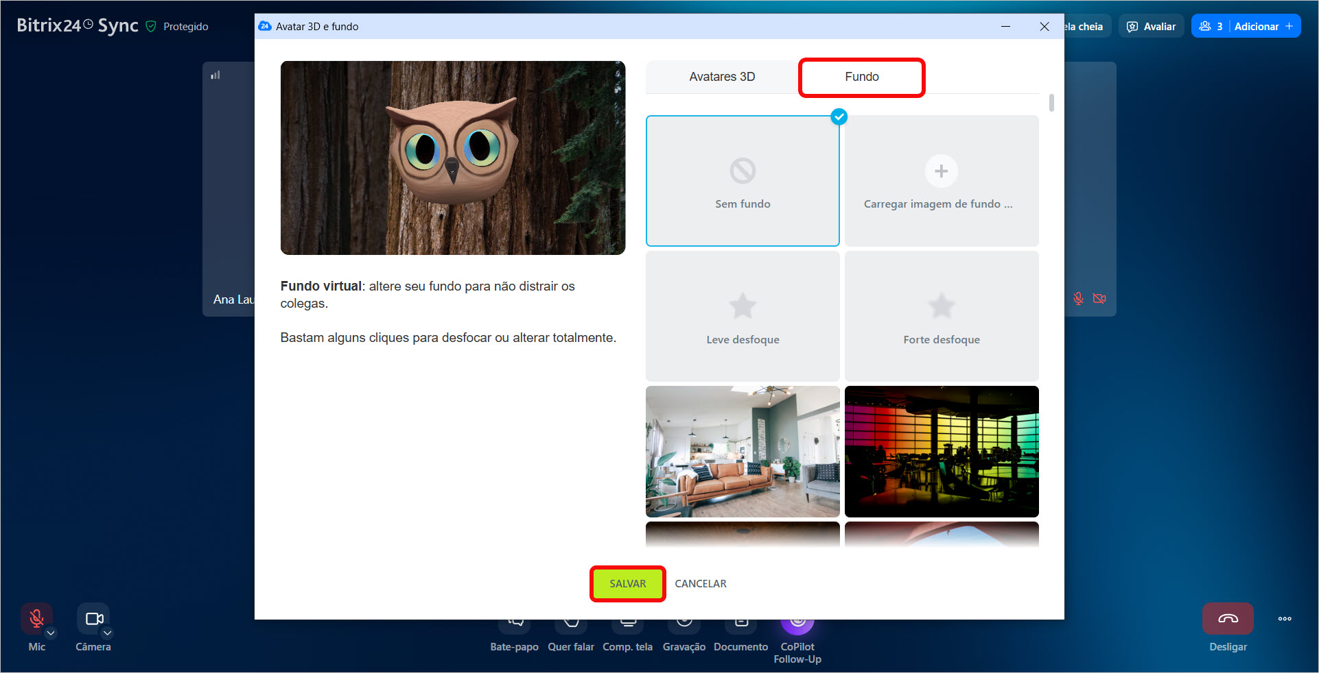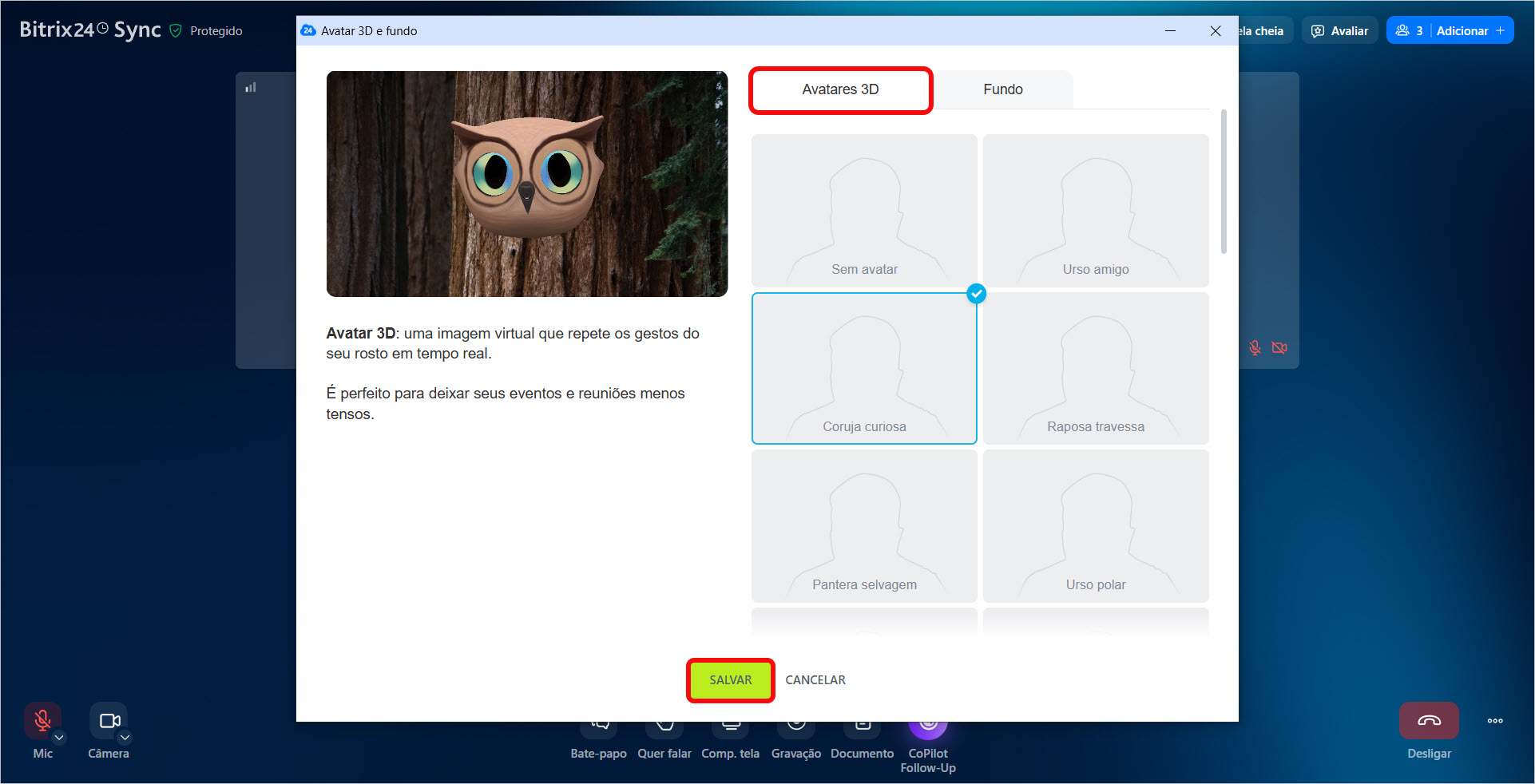 • A capacidade de gravar chamadas de vídeo, alterar o plano de fundo e selecionar um avatar 3D está disponível apenas no aplicativo Bitrix24 Messenger.