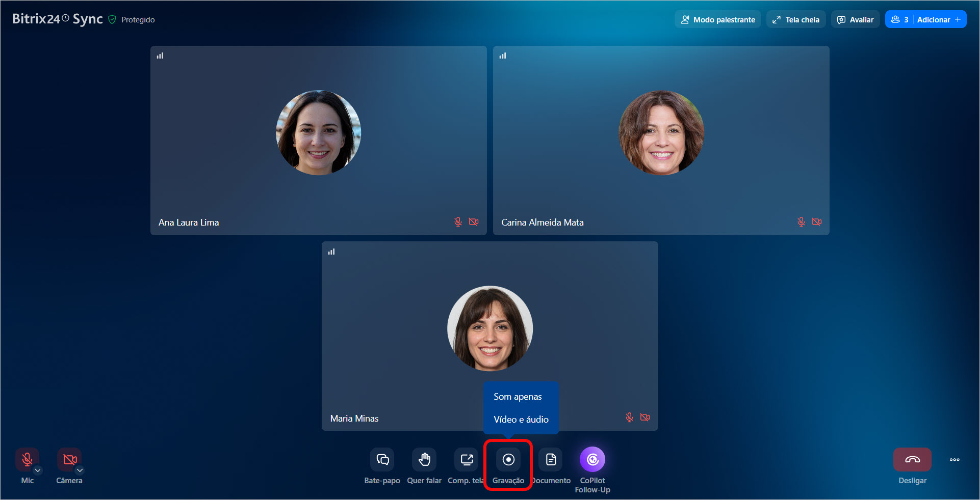Você pode gravar uma chamada tanto pelo Bitrix24 Messenger quanto pelo navegador. Clique em Gravar ou use o atalho Ctrl + Shift + R (Cmd + Shift + R no macOS). Escolha entre gravar apenas áudio ou áudio e vídeo.