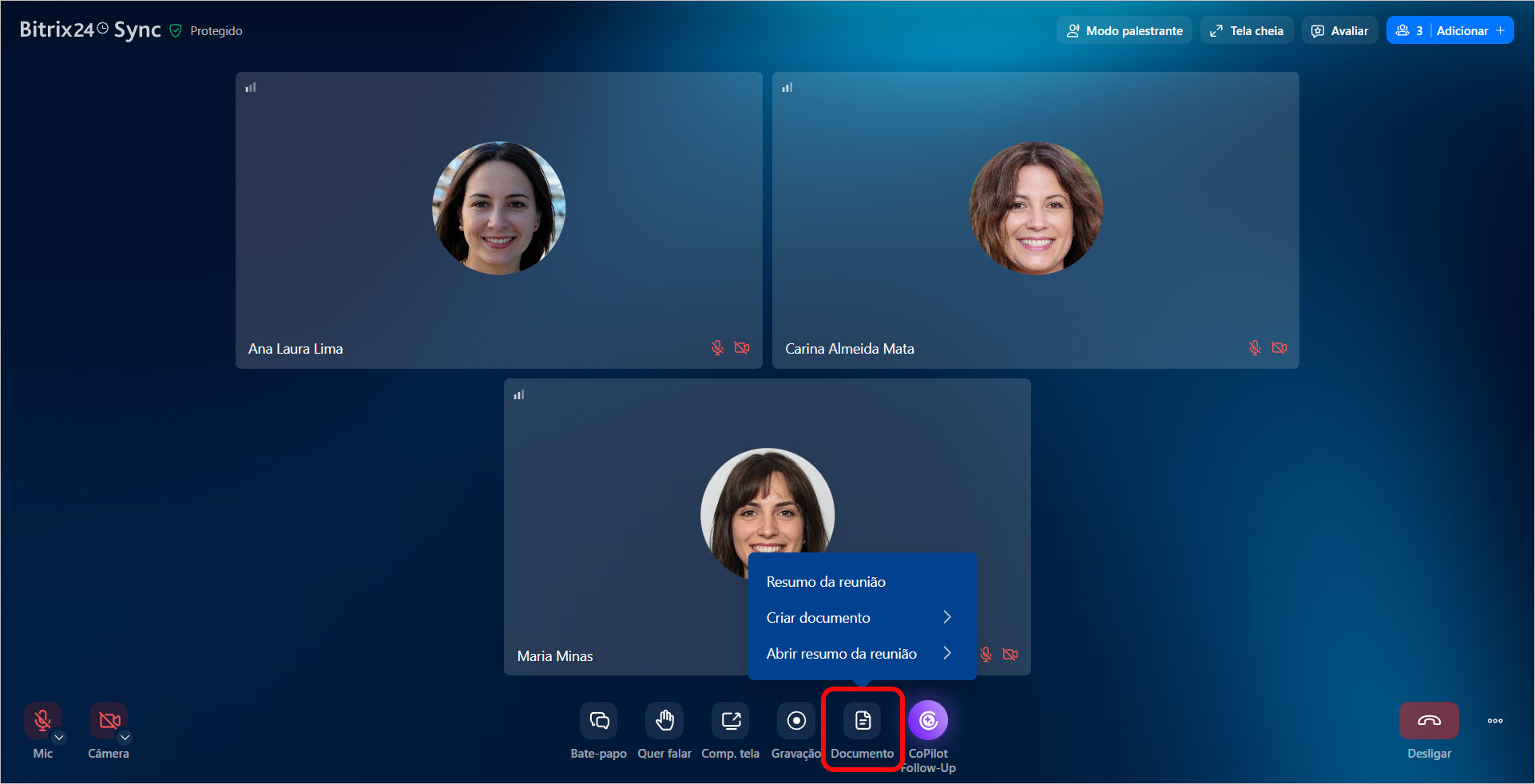 Durante a videchamada, você pode criar um documento ou ata para registrar o que foi tratado e colaborar na sua edição. Clique em Documento na janela da chamada.