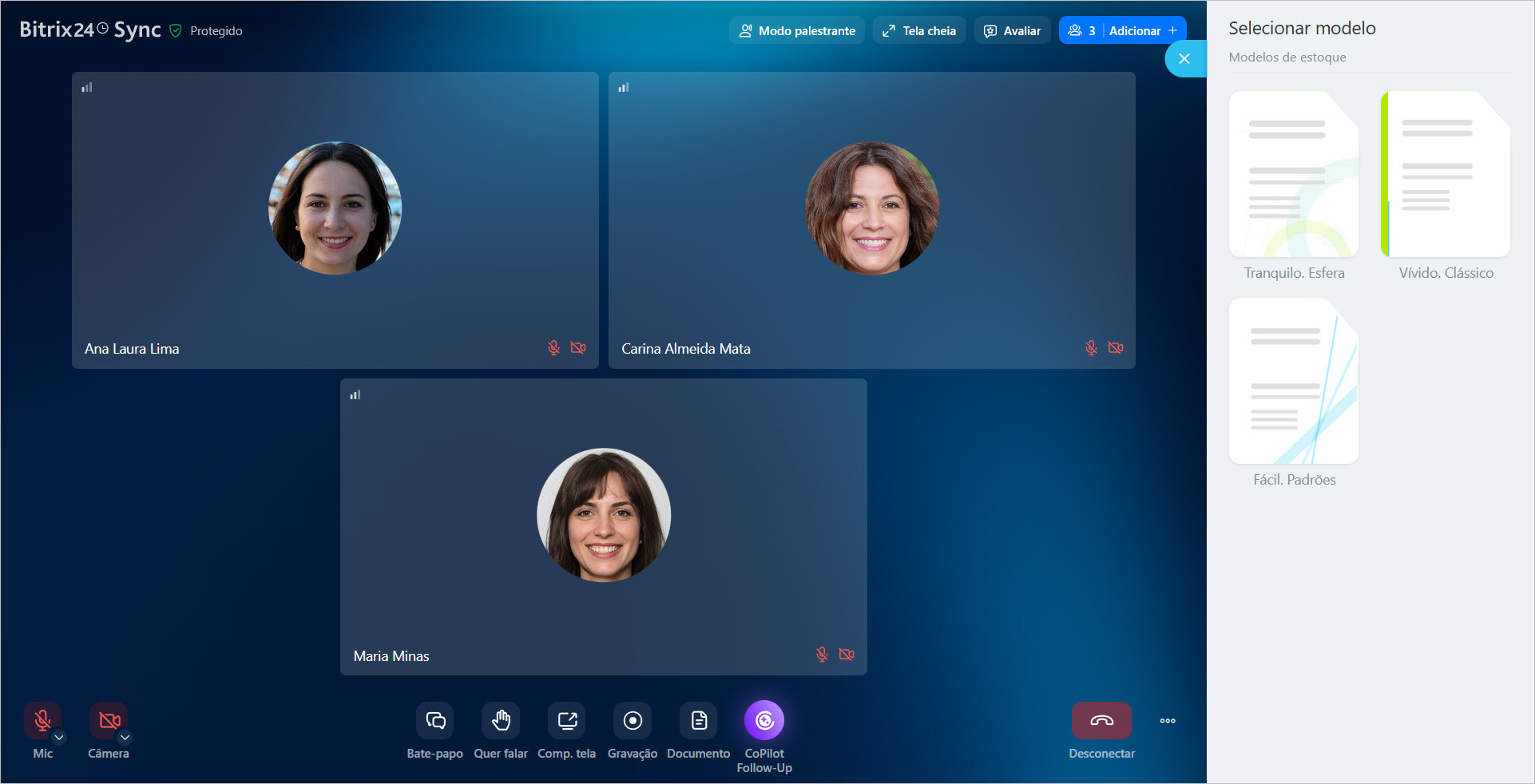 • Resumo da reunião: registra os pontos tratados em um documento de texto usando um modelo, se preferir.