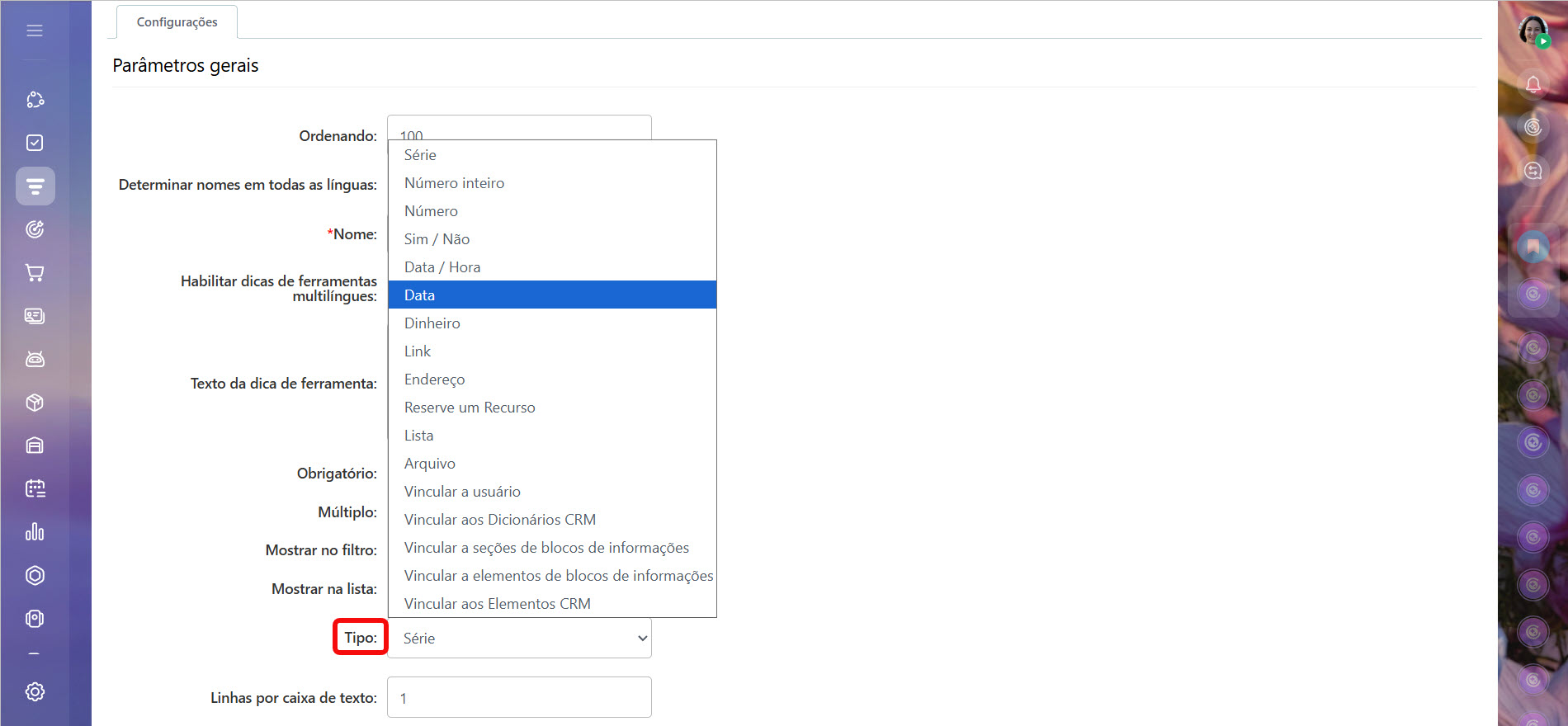 Existem vários tipos de campos personalizados no CRM. Eles são usados para armazenar diferentes tipos de dados. Você pode escolher o tipo ao criar um campo. There are several types of custom fields in CRM. They are used for storing different types of data. You can choose the type when creating a field.
