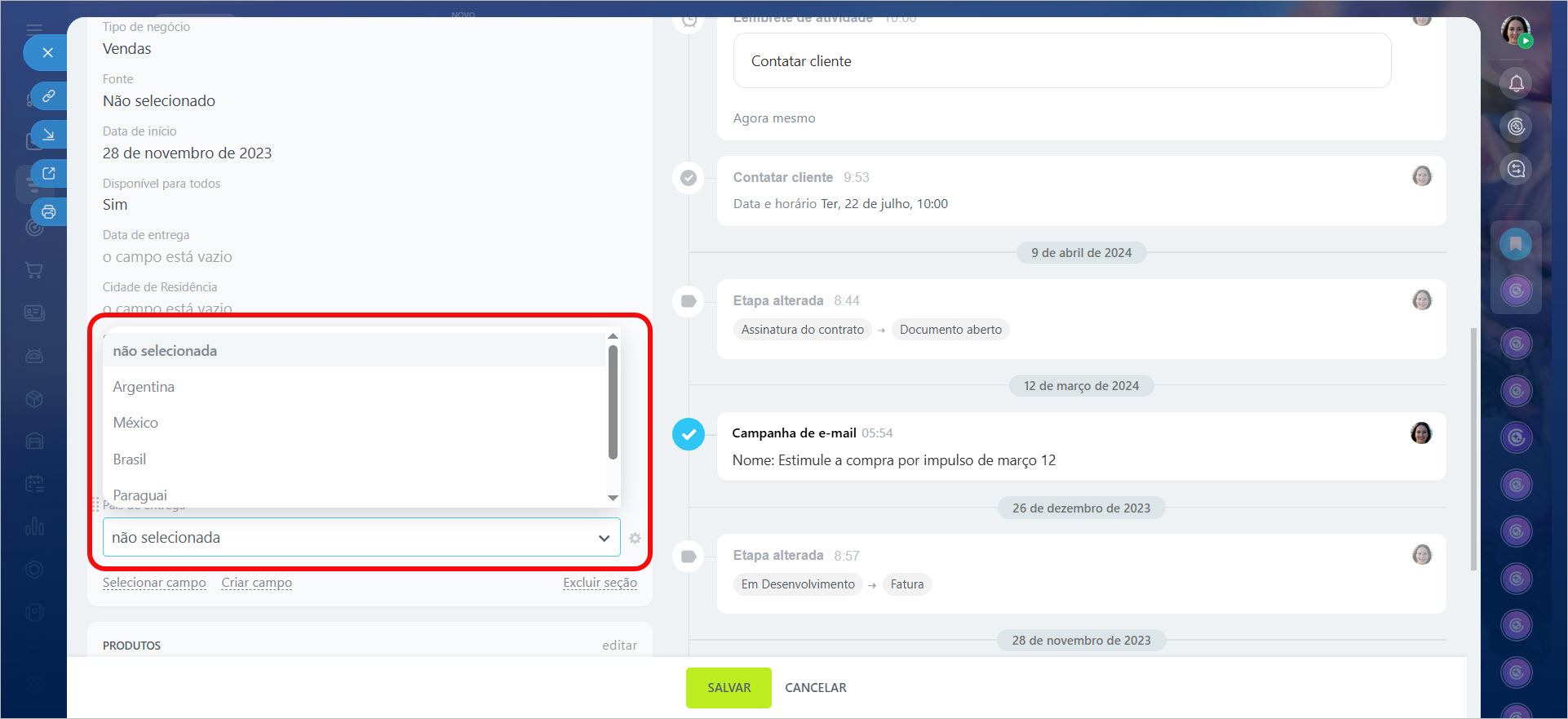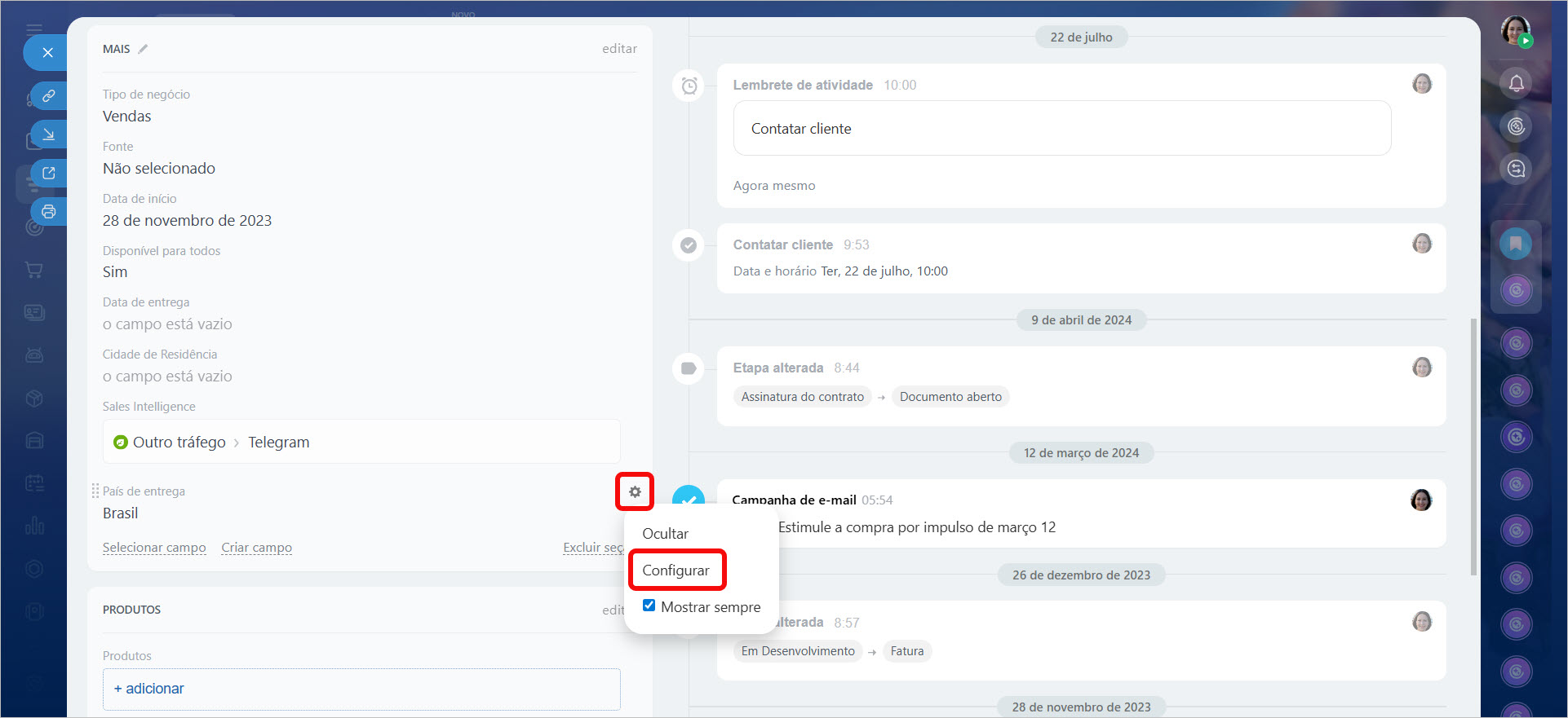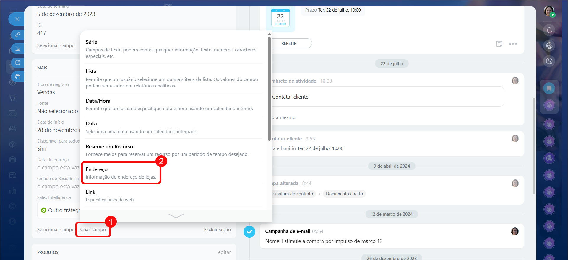 - Você pode criar um campo no cartão do elemento ou nas configurações do CRM.