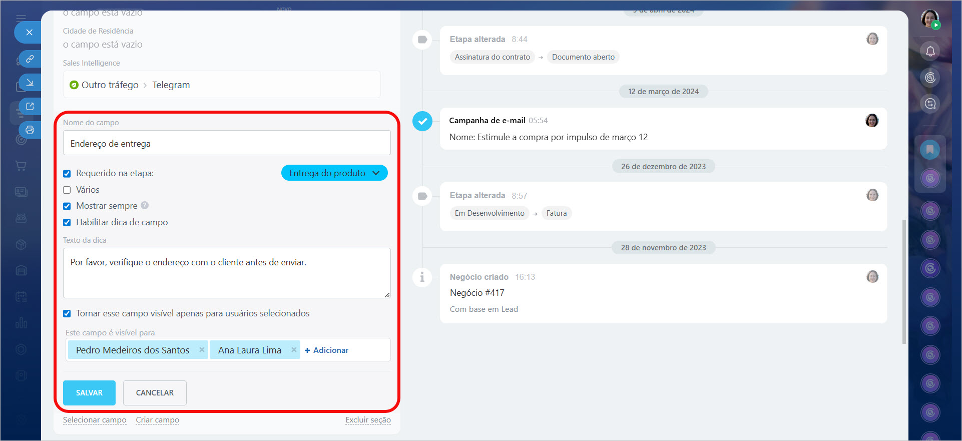 - Tornar esse campo visível apenas para usuários selecionados: permite selecionar quais funcionários podem ver as informações neste campo. Será escondido dos outros.