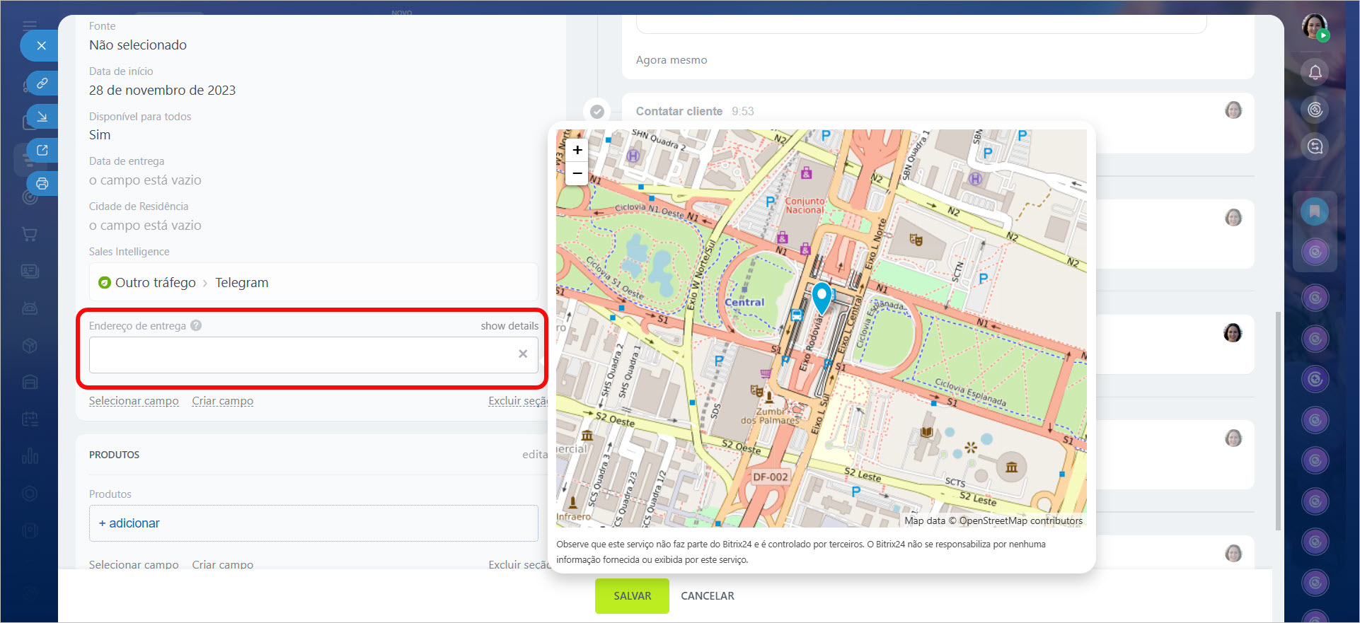 - Endereço: selecione um endereço no mapa (por exemplo, endereço de entrega).