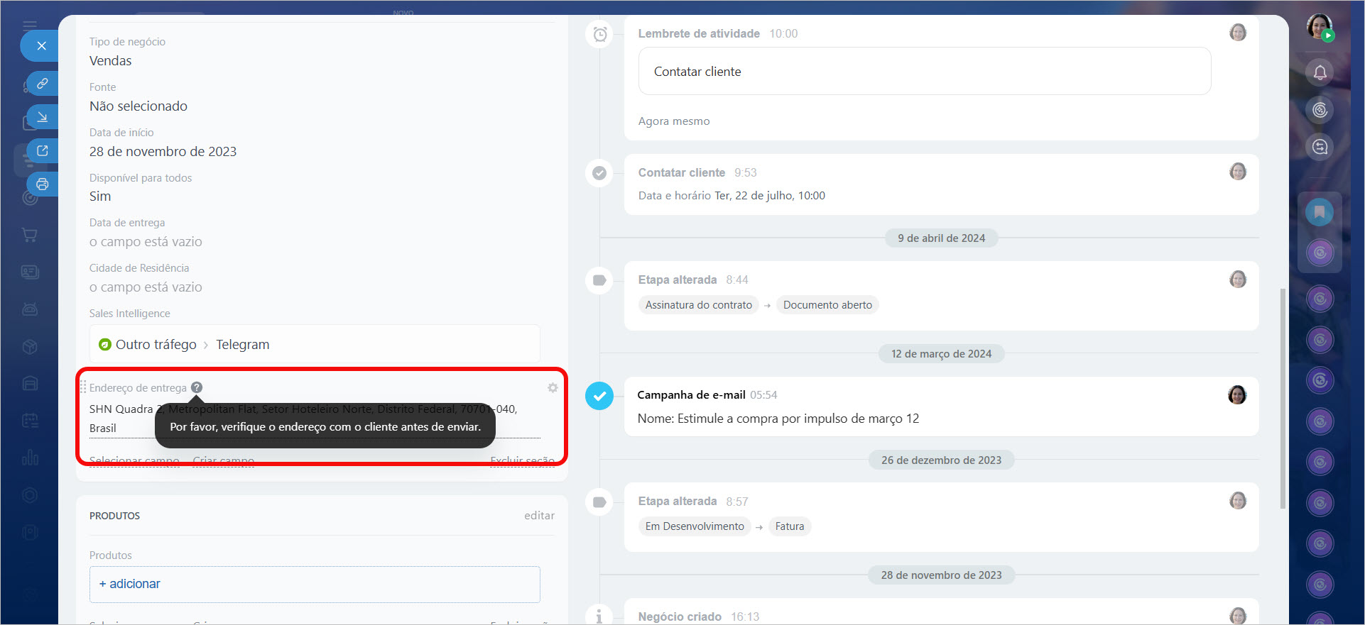 Use campos personalizados para armazenar informações adicionais do cliente quando os campos padrão não forem suficientes. Crie campos e personalize cartão para atender às necessidades do seu negócio. Por exemplo, se sua empresa entrega produtos, crie campos para endereço de entrega, horário e número do pedido.