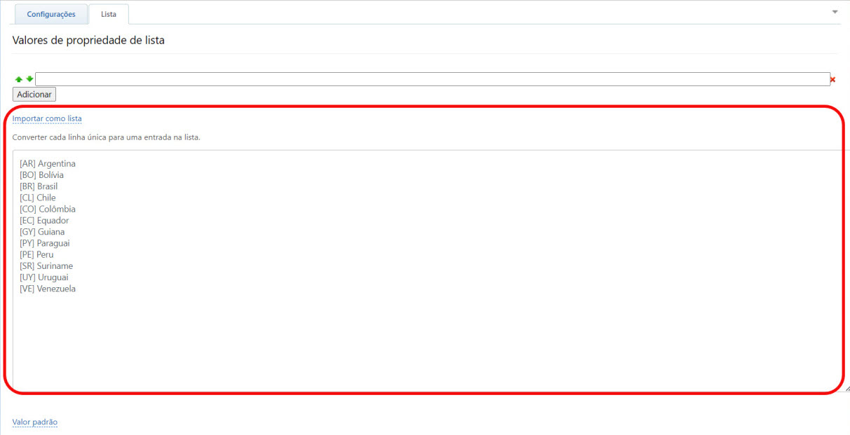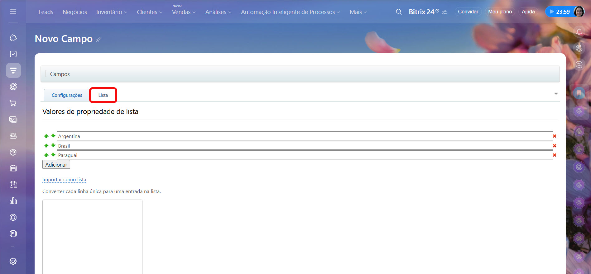 Para trocar dados entre o Bitrix24 e sistemas externos, pode ser necessário especificar um valor de código para cada item da lista. Por exemplo, [MX]México, onde México é o título do item no Bitrix24 e [MX] é o código para troca do sistema.