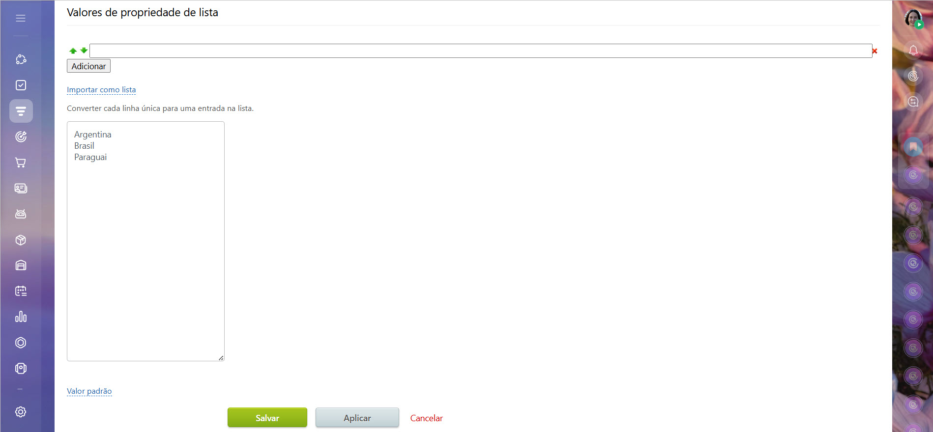 Criar um campo nas configurações do CRM. Este método é adequado para campos que requerem configurações adicionais, como listas com muitos valores ou vínculos a diferentes elementos do CRM.