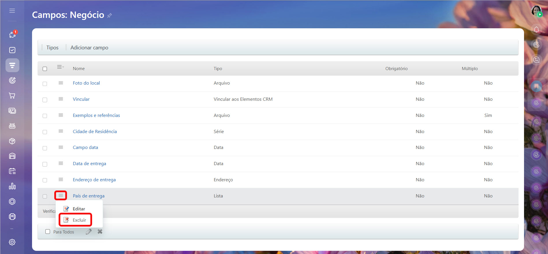 Você pode editar as configurações de campo no cartão do elemento ou nas configurações do CRM. A exclusão de campos personalizados só é possível nas configurações do CRM.