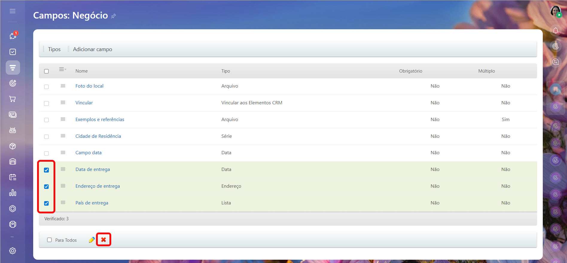 - Ao excluir um campo, todos os dados vinculados a ele também serão excluídos.