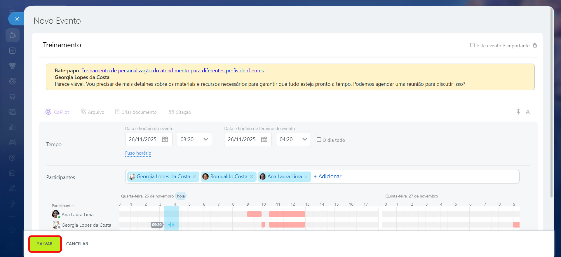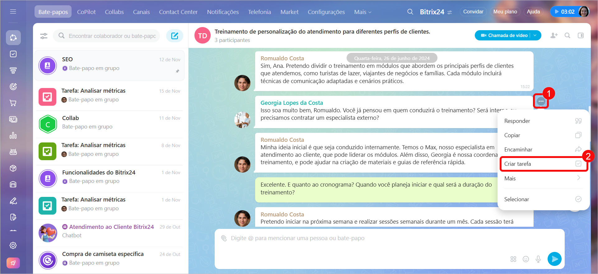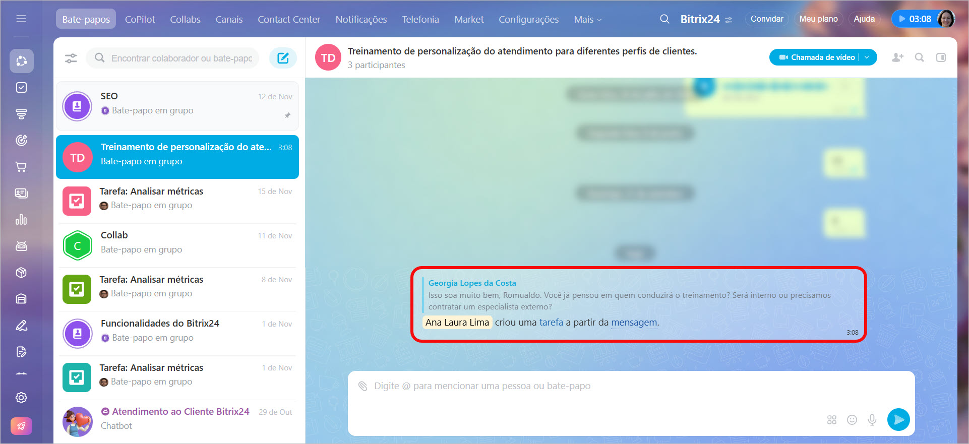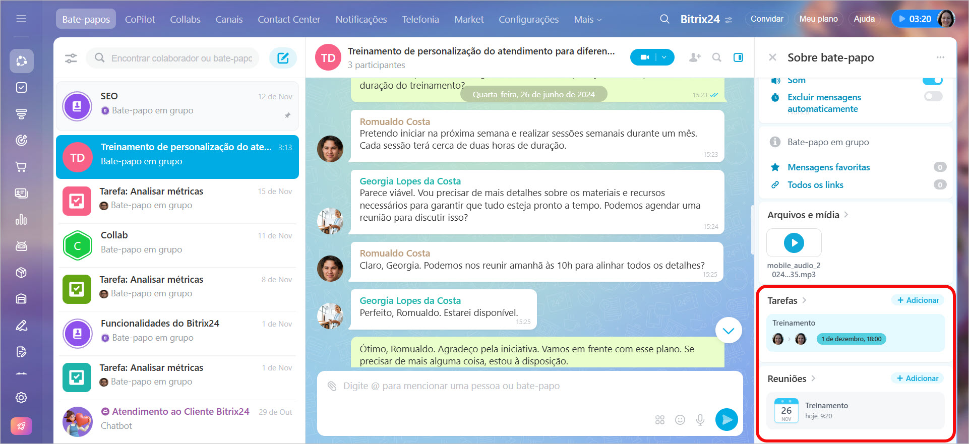 - Em chats, os participantes são automaticamente adicionados à tarefa ou reunião, economizando tempo e garantindo que ninguém seja esquecido.