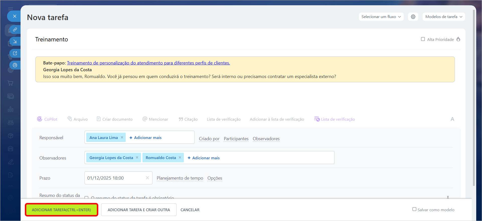 - Ao criar uma tarefa a partir de uma mensagem em um chat privado, você será o responsável e o criador, e a outra pessoa será adicionada como observadora. Em um chat em grupo, todos os participantes serão observadores. No canal, os observadores precisam ser adicionados manualmente.