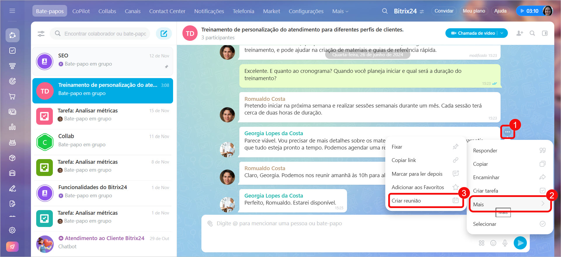 Selecione a mensagem, postagem ou comentário, clique com o botão direito ou em Três pontos (...) > Mais > Criar reunião. Um painel lateral será aberto. Insira o título da reunião, defina o horário e escolha o calendário — Pessoal ou da Empresa. Para cada participante, o horário do evento será ajustado automaticamente ao seu fuso horário.