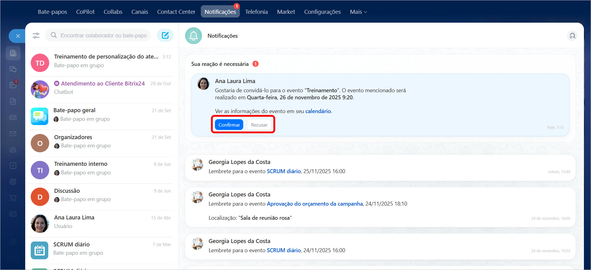 Os participantes da reunião receberão uma notificação sobre o evento no Centro de Notificações. Eles podem confirmar ou recusar a participação. Você será notificado sobre a decisão no Centro de Notificações se marcar a opção Notificar quando os participantes confirmarem ou recusarem o convite ao criar a reunião.