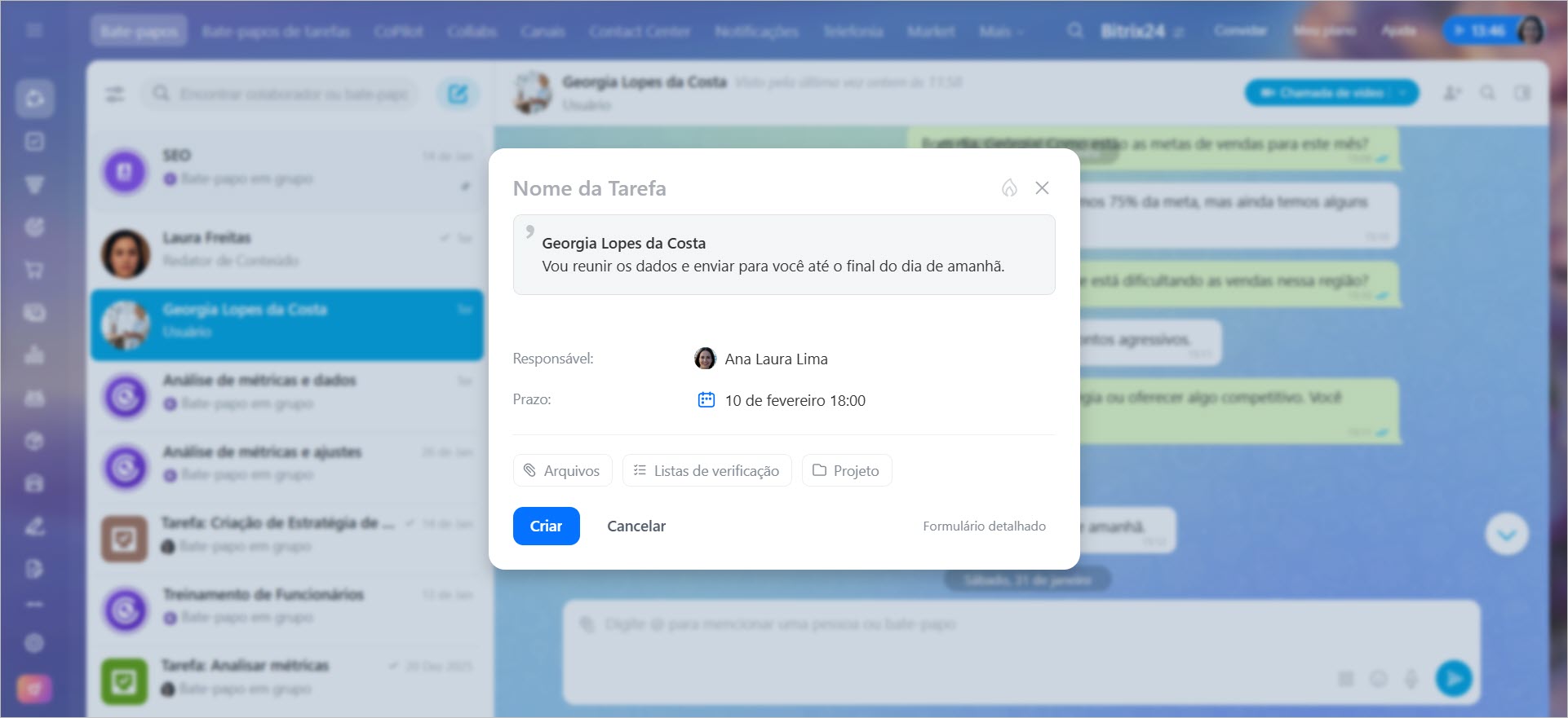 - Em chats, os participantes são automaticamente adicionados à tarefa ou reunião, economizando tempo e garantindo que ninguém seja esquecido.
