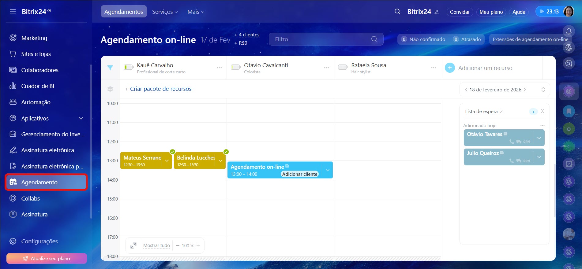 Overbooking é a possibilidade de agendar dois clientes no mesmo horário. Se um dos clientes cancelar ou remarcar, o horário é ocupado pelo outro cliente. Dessa forma, você não perde clientes e utiliza os recursos da empresa com eficiência.