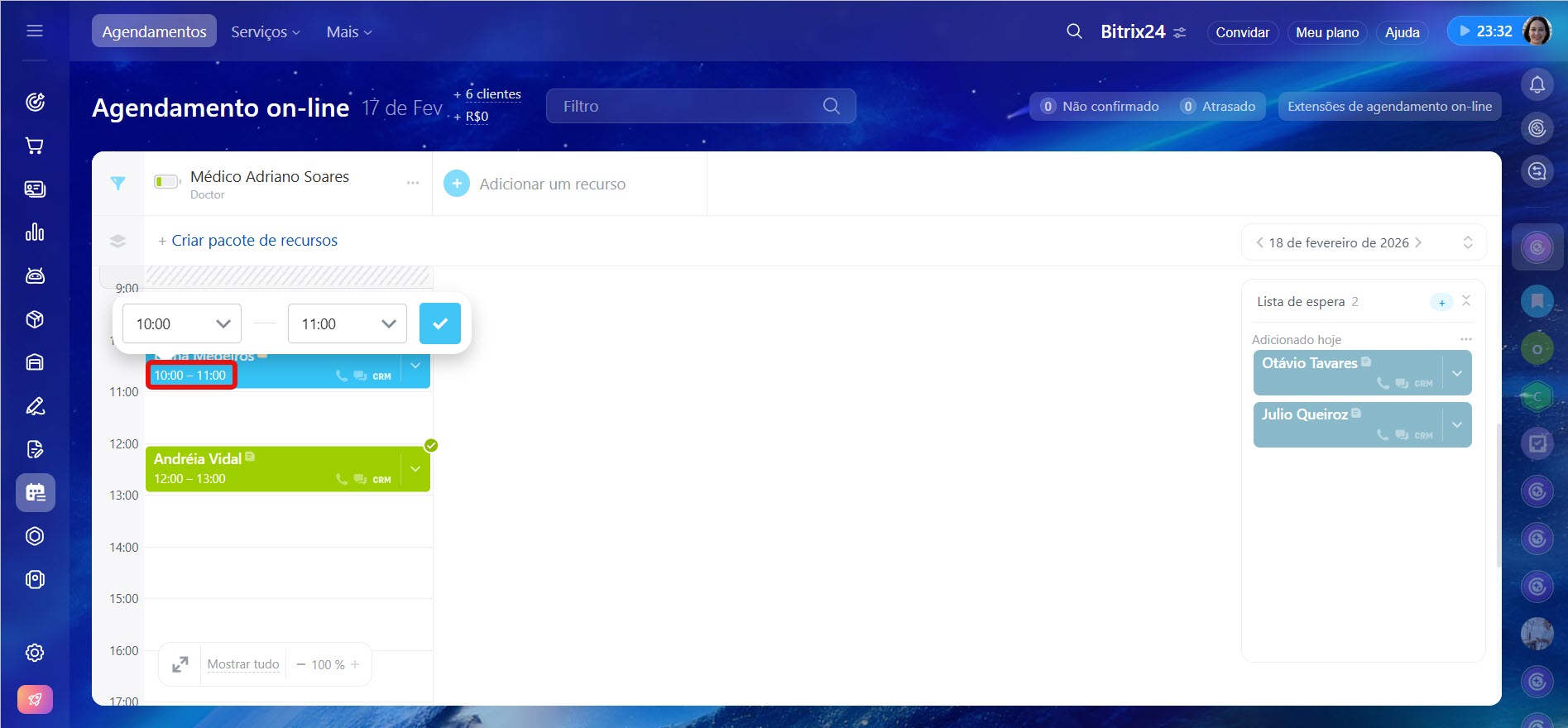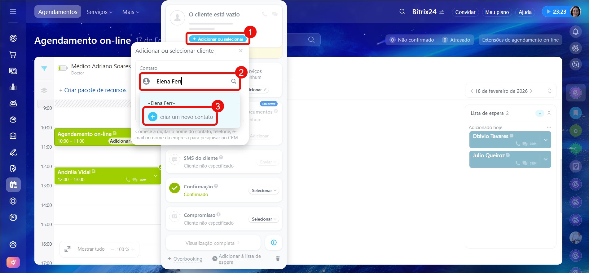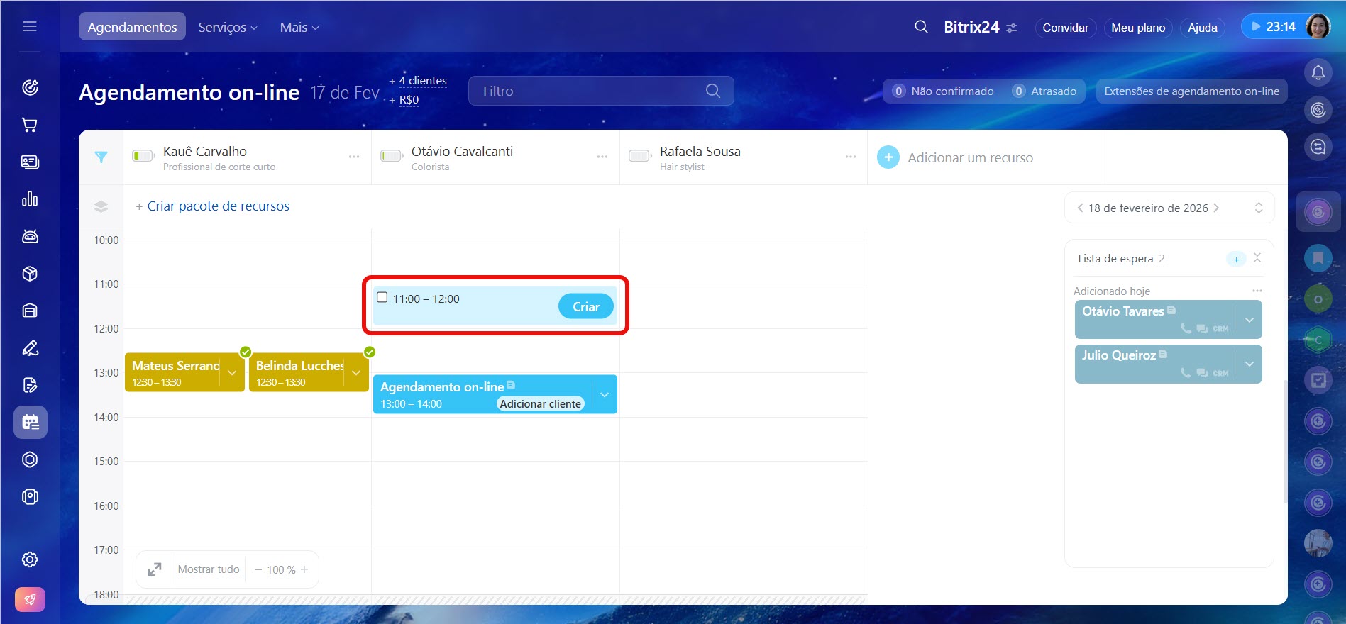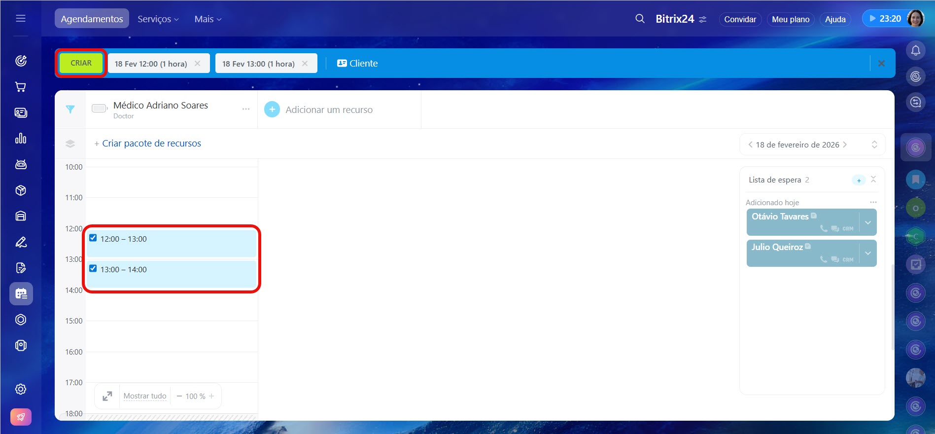 - Primeiro, crie pelo menos um recurso. Em seguida, selecione o horário desejado e clique em Criar. Você pode agendar vários compromissos para um mesmo cliente.