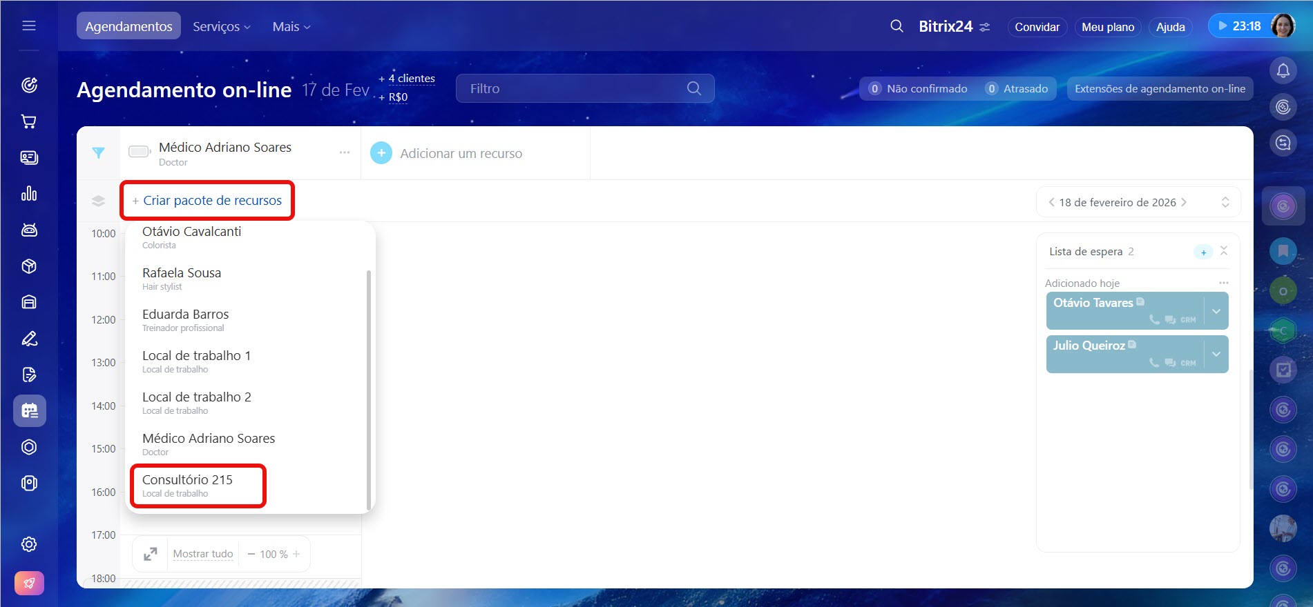 Se precisar de um recurso adicional, clique em + Criar pacote de recursos e escolha o recurso, como um médico e seu consultório.