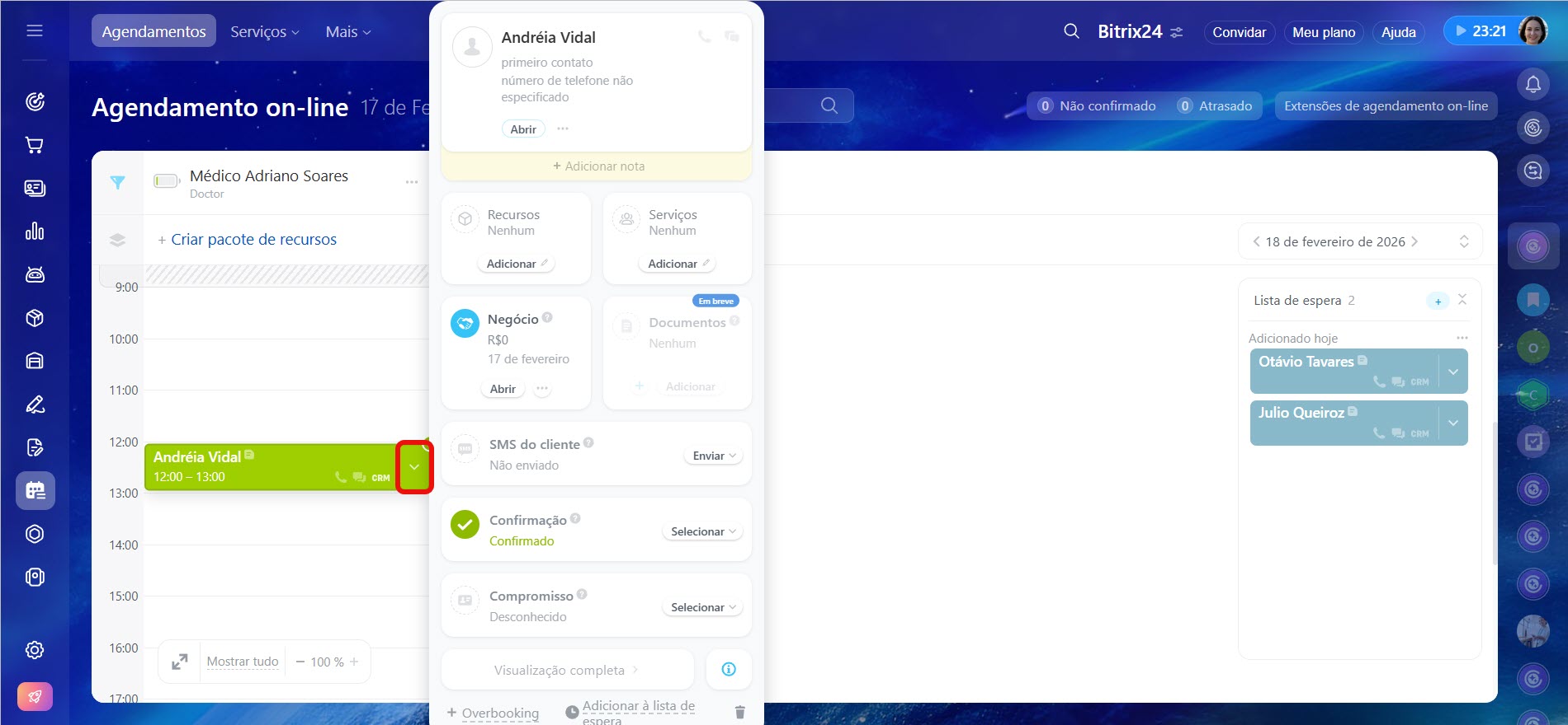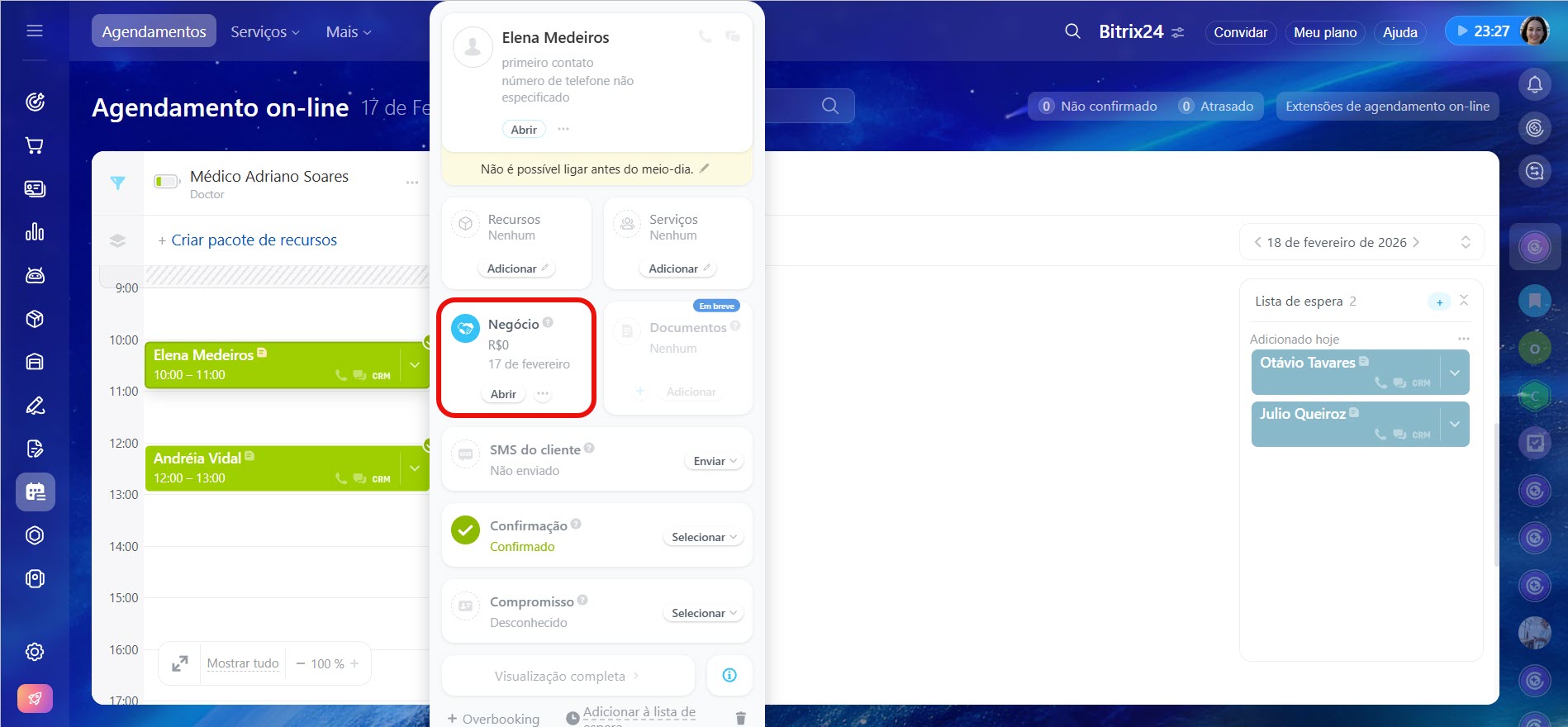 Caso o cliente confirme o agendamento através do link da mensagem, ele será atualizado automaticamente no Bitrix24.