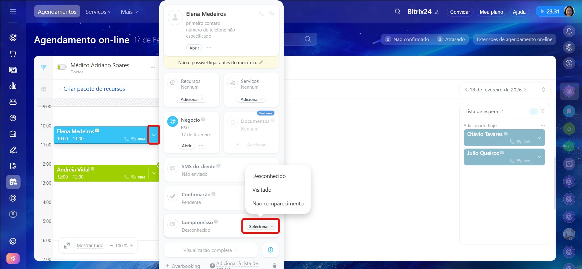 Para alterar o horário de um compromisso, clique no horário atual e escolha o novo.