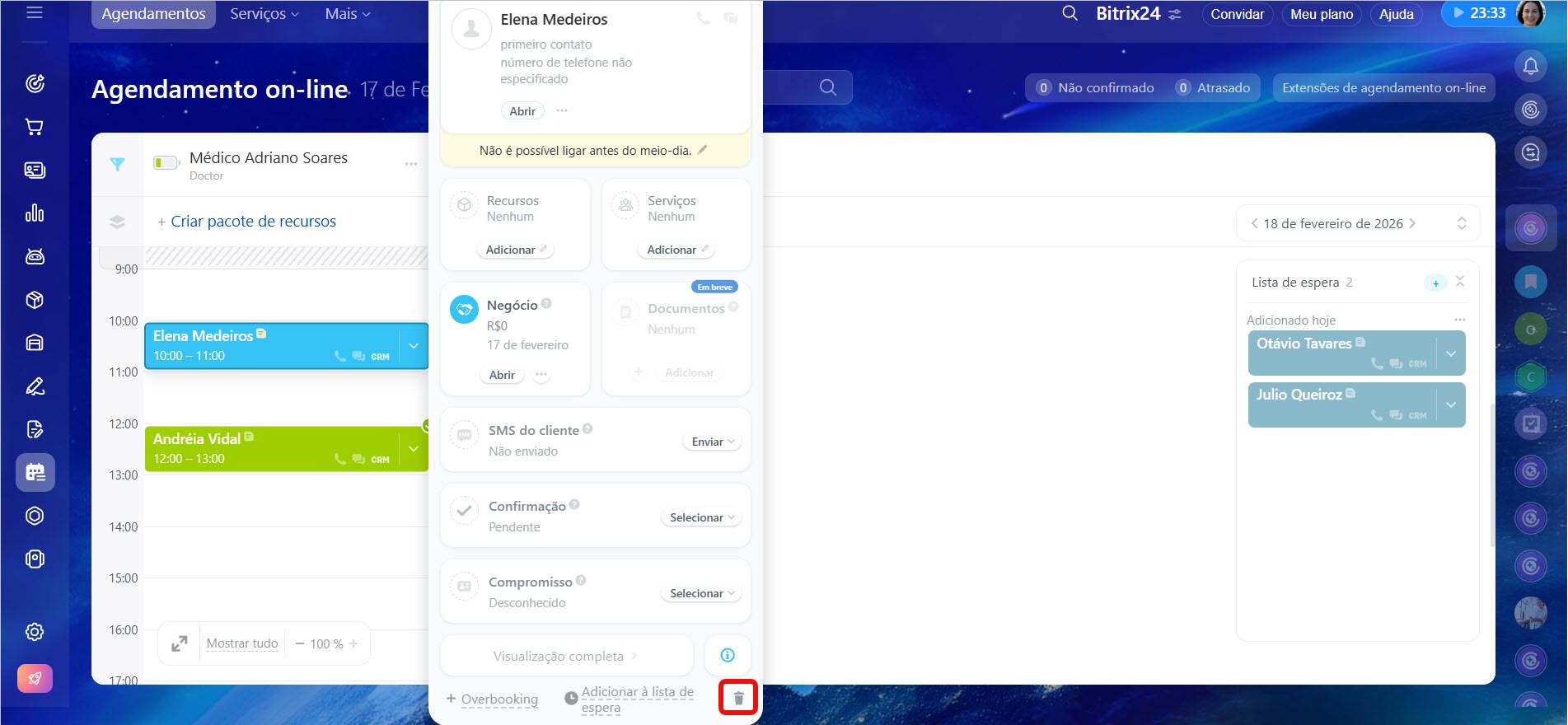 Se precisar excluir um compromisso criado por engano, clique na lixeira.