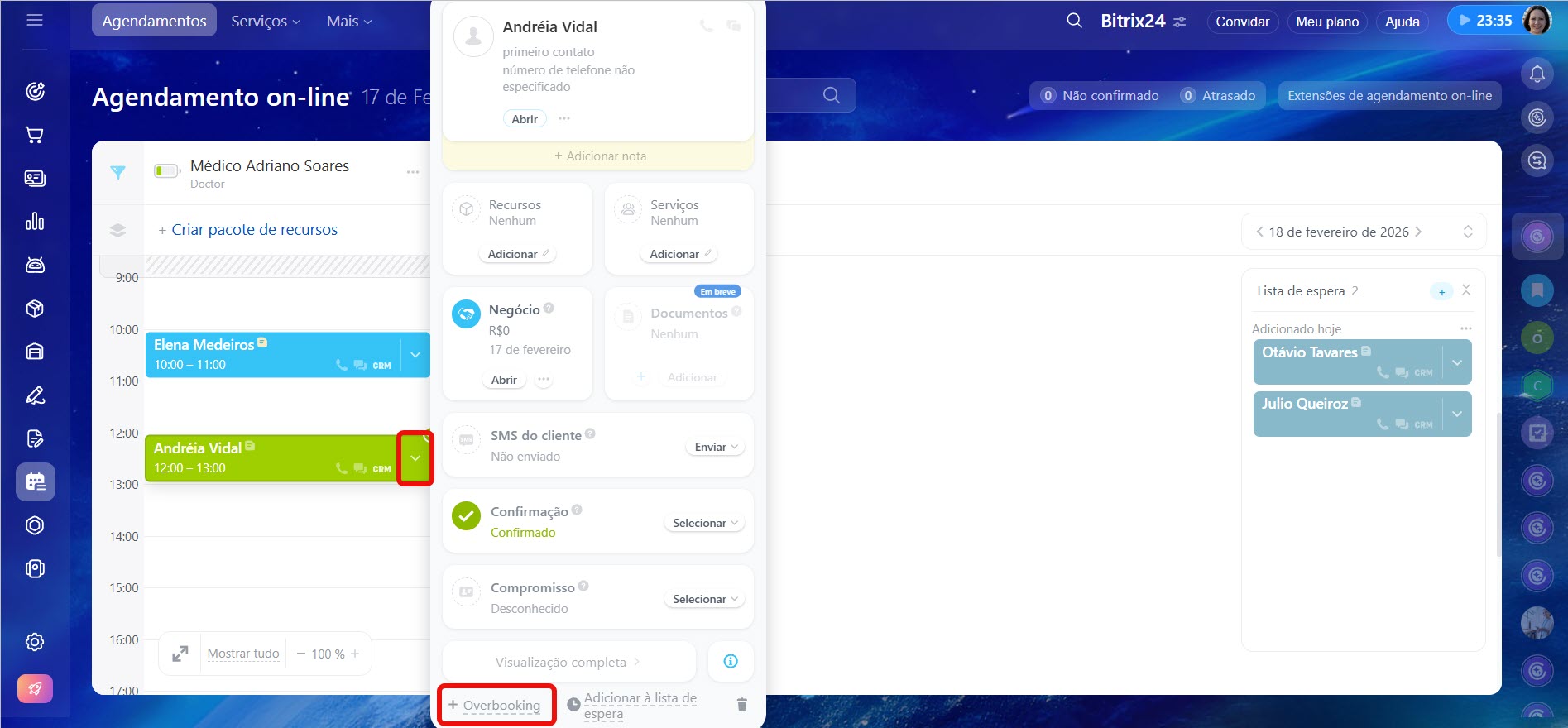 Adicionar um cliente a um agendamento existente. Clique na seta no bloco do agendamento existente e selecione Overbooking. Preencha o cartão: adicione o cliente e o negócio.