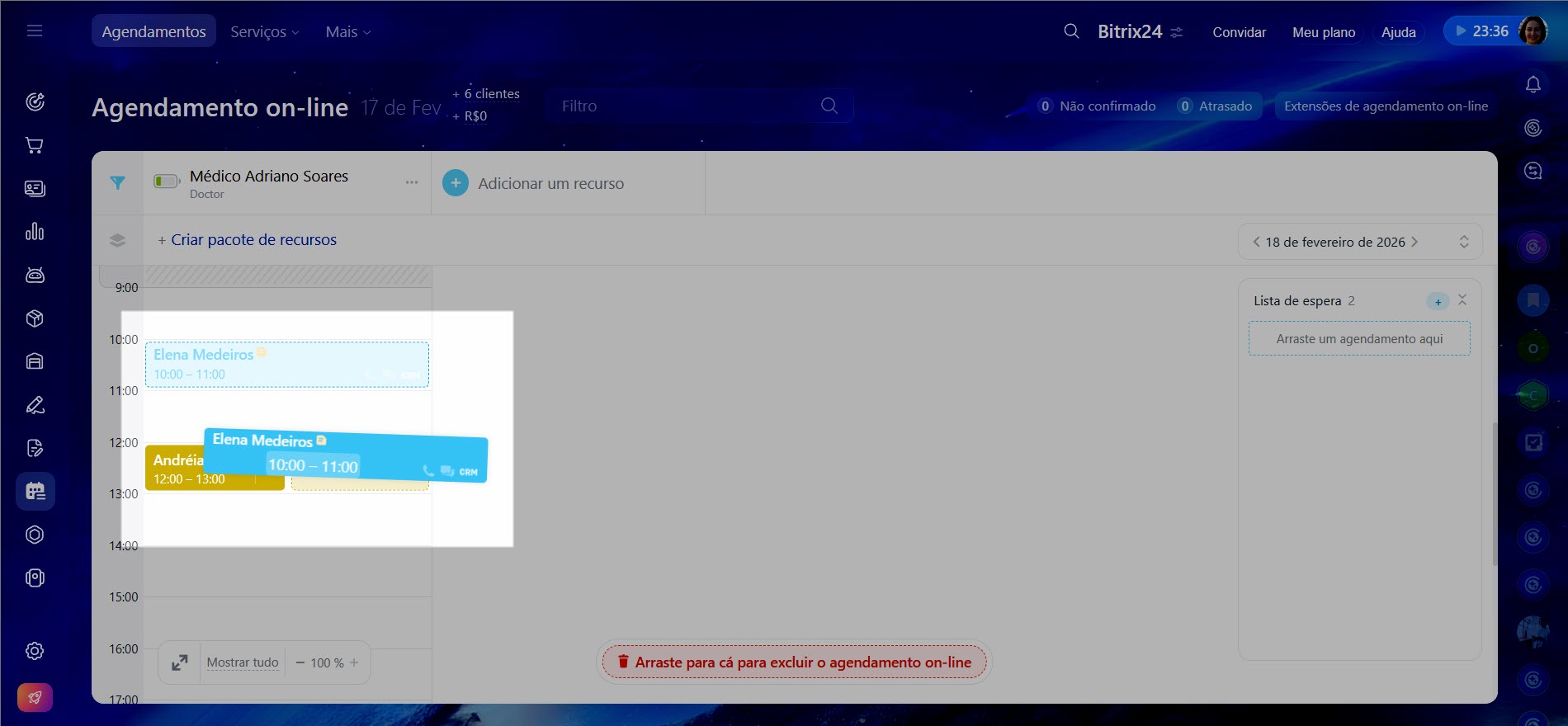 Remarcar um agendamento. Mantenha o mouse pressionado sobre o agendamento existente e arraste-o para um horário já ocupado.
