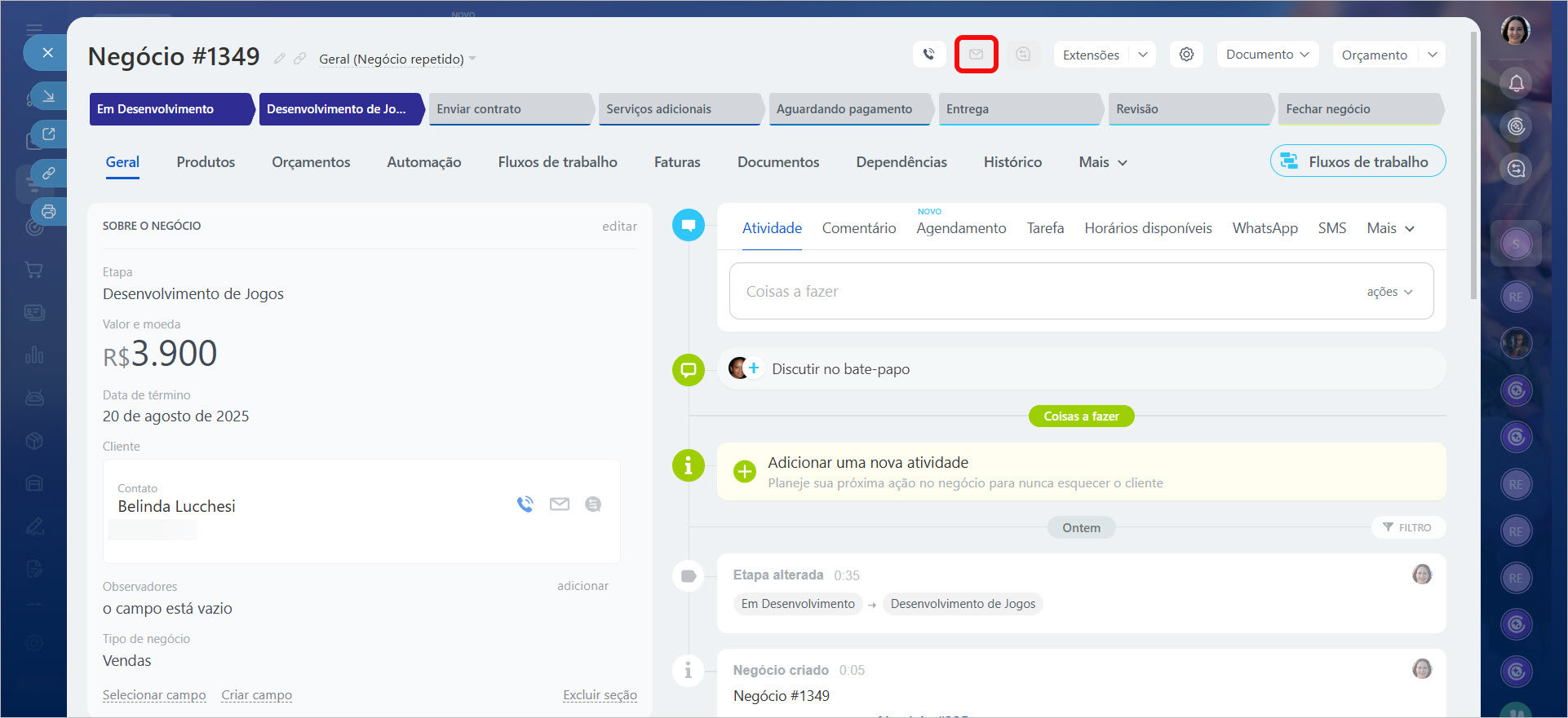 Razão. É possível enviar um e-mail a partir do negócio apenas para um contato ou empresa vinculados a ele.