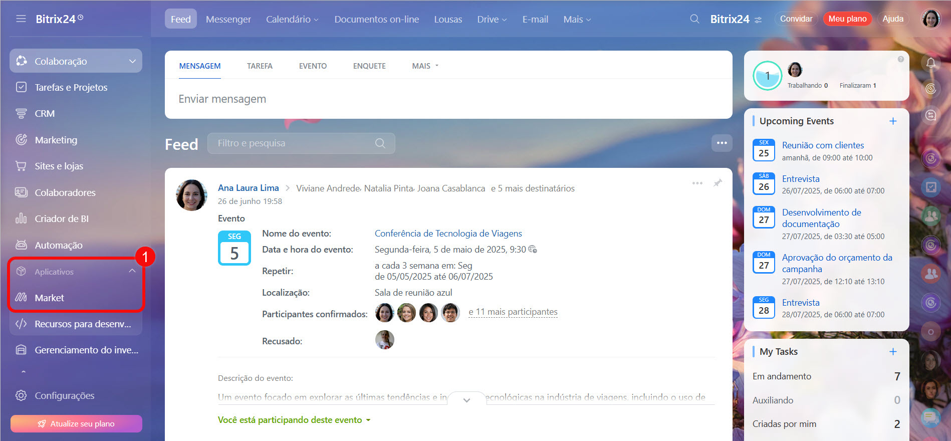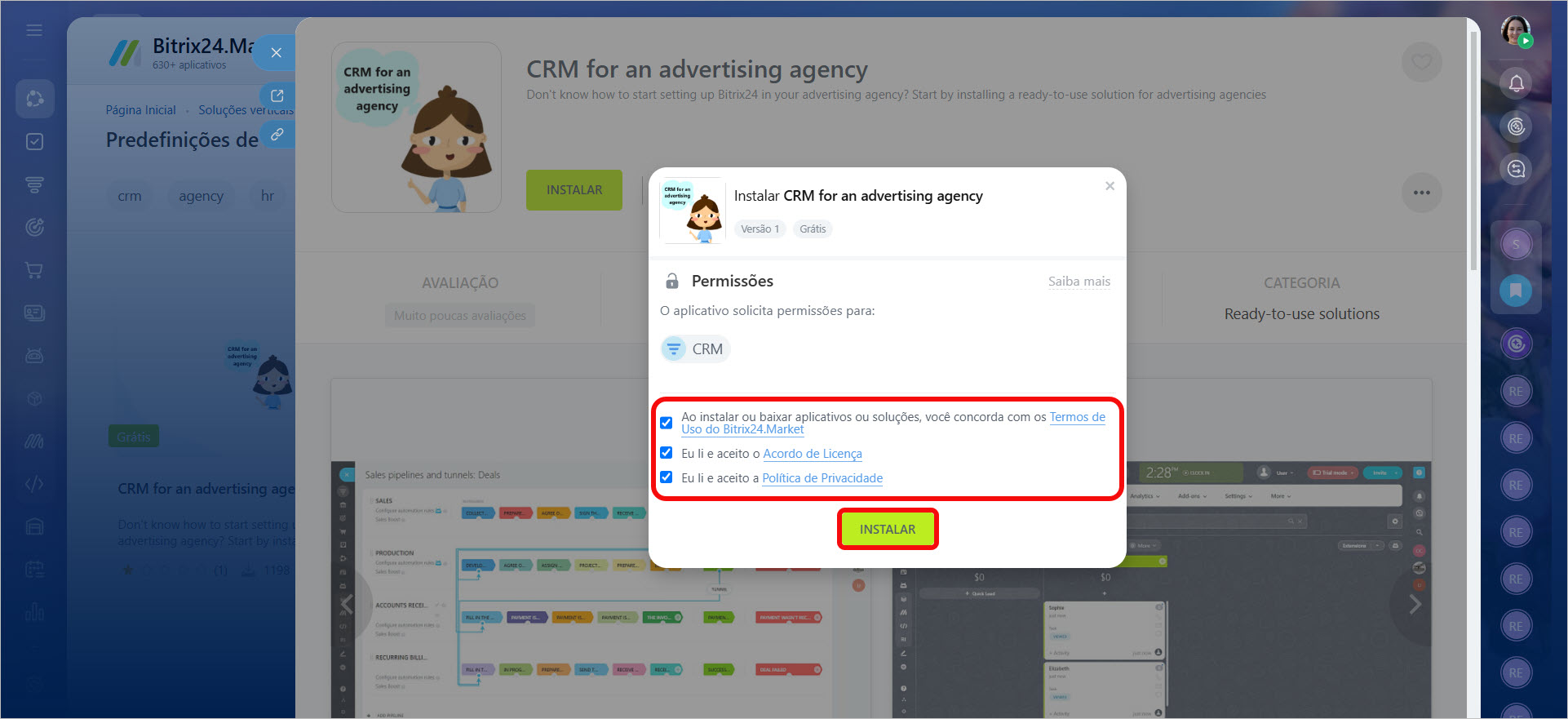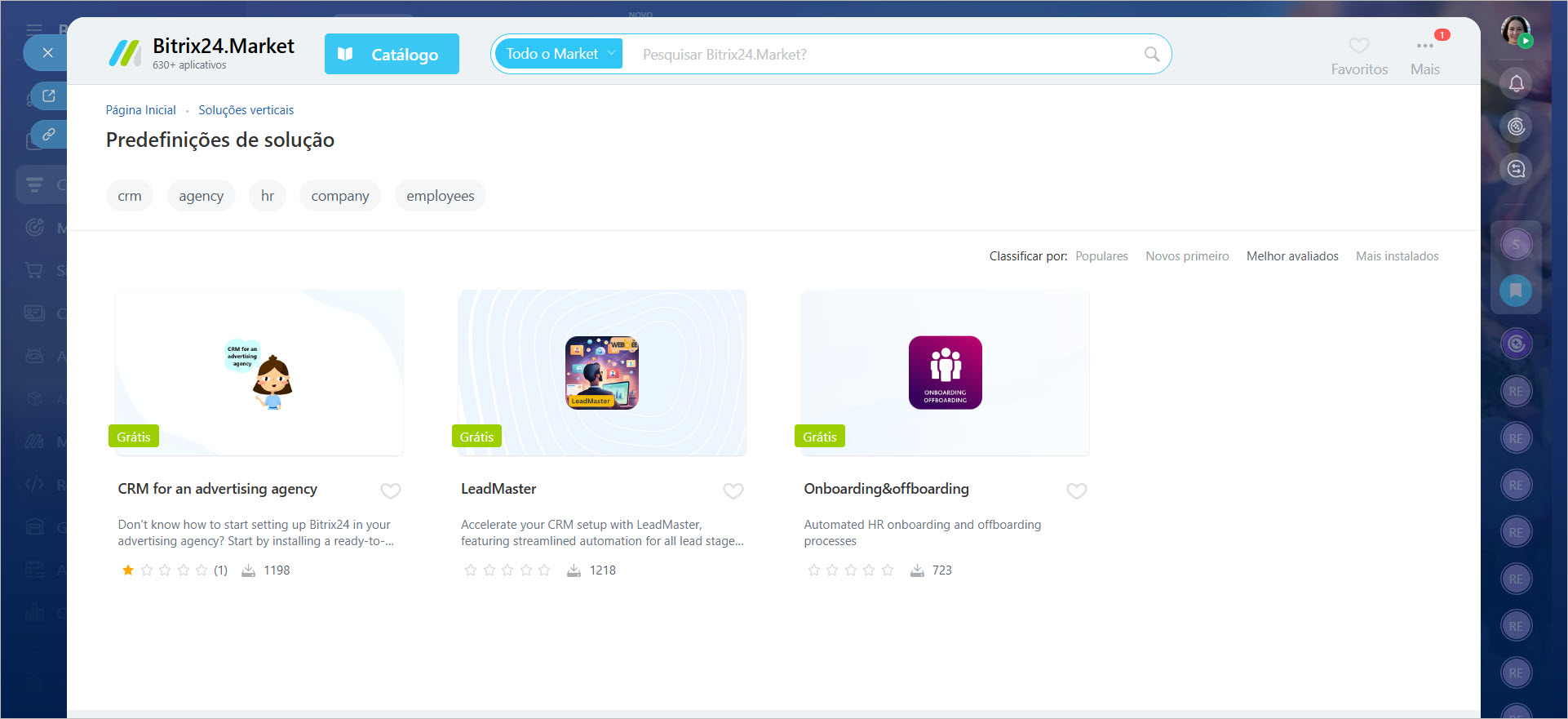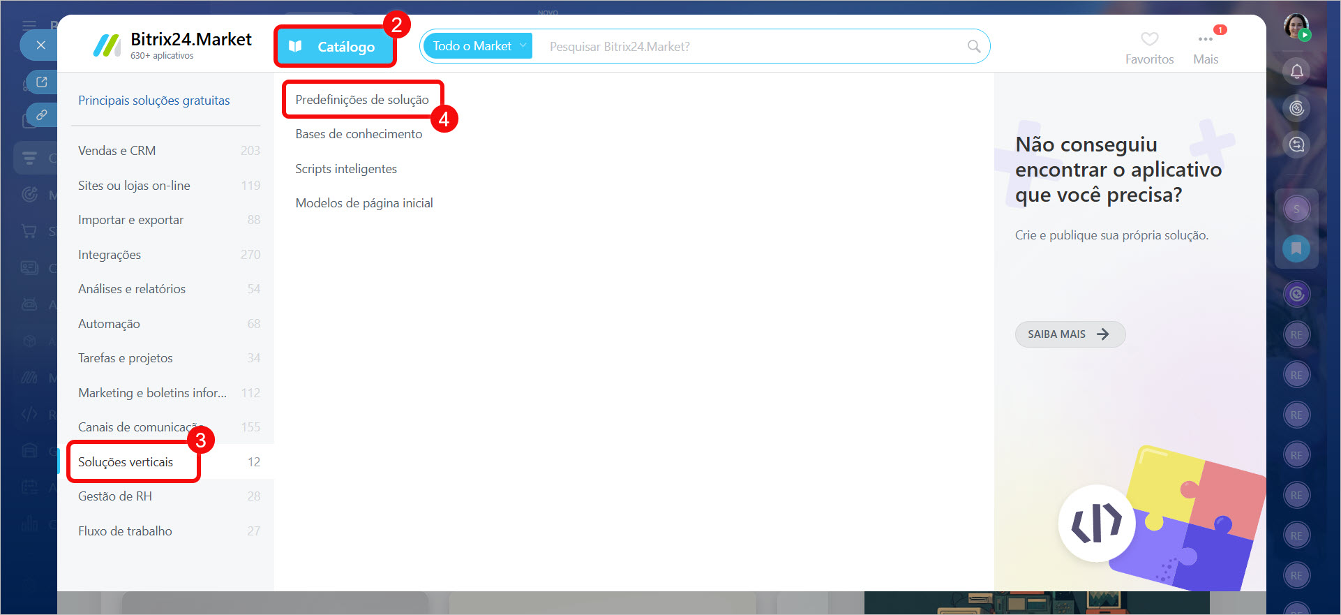 Após clicar no link fornecido pelo Parceiro Bitrix24 e criar sua conta Bitrix24, você pode importar o preset da solução. Para isso, vá para a seção Aplicativos > Market.