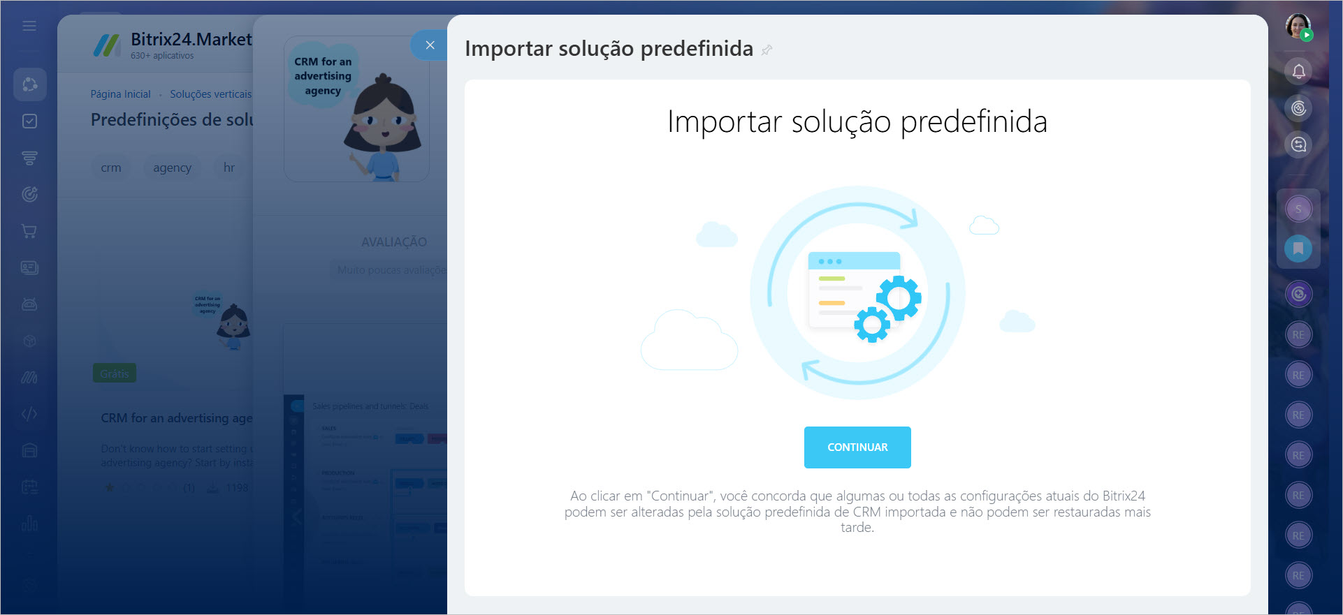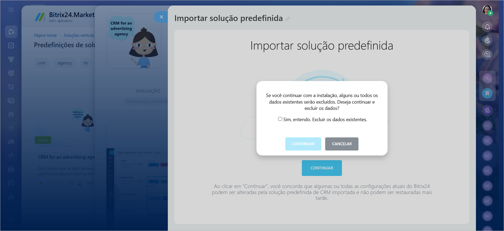 Haverá um aviso dizendo que todos os seus dados de CRM serão excluídos. Se você criou sua conta e imediatamente prosseguiu para a importação do preset da solução, não há com o que se preocupar.