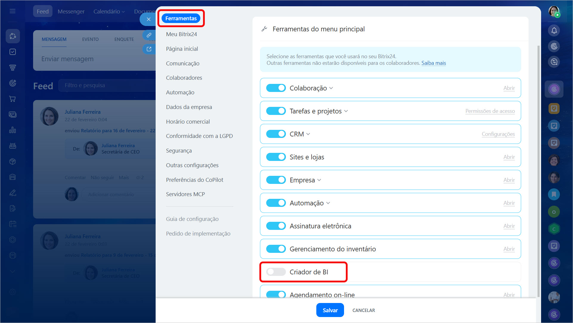 3–4. Nas configurações, desative o Criador de BI e salve as alterações.