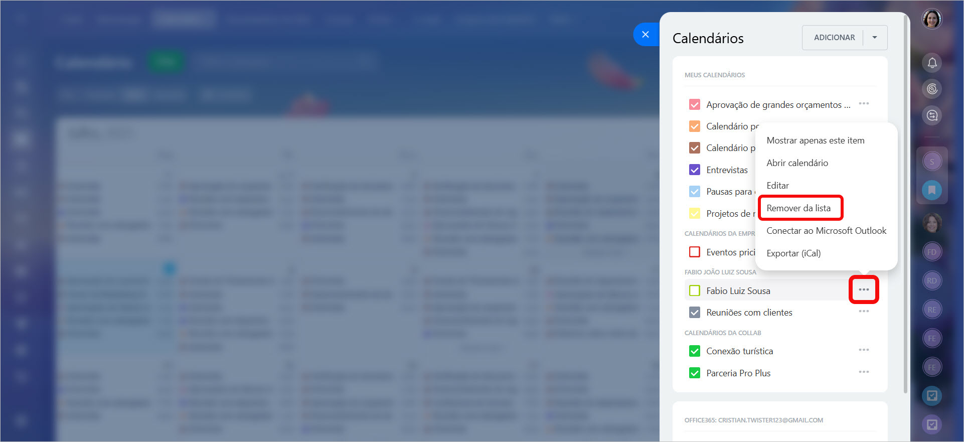 Se eventos de outros colaboradores aparecem no seu calendário, isso significa que você adicionou o calendário de um colega, departamento, empresa ou collab. Para que esses eventos não interfiram na organização da sua agenda pessoal, é possível desativar ou ocultar os calendários indesejados.