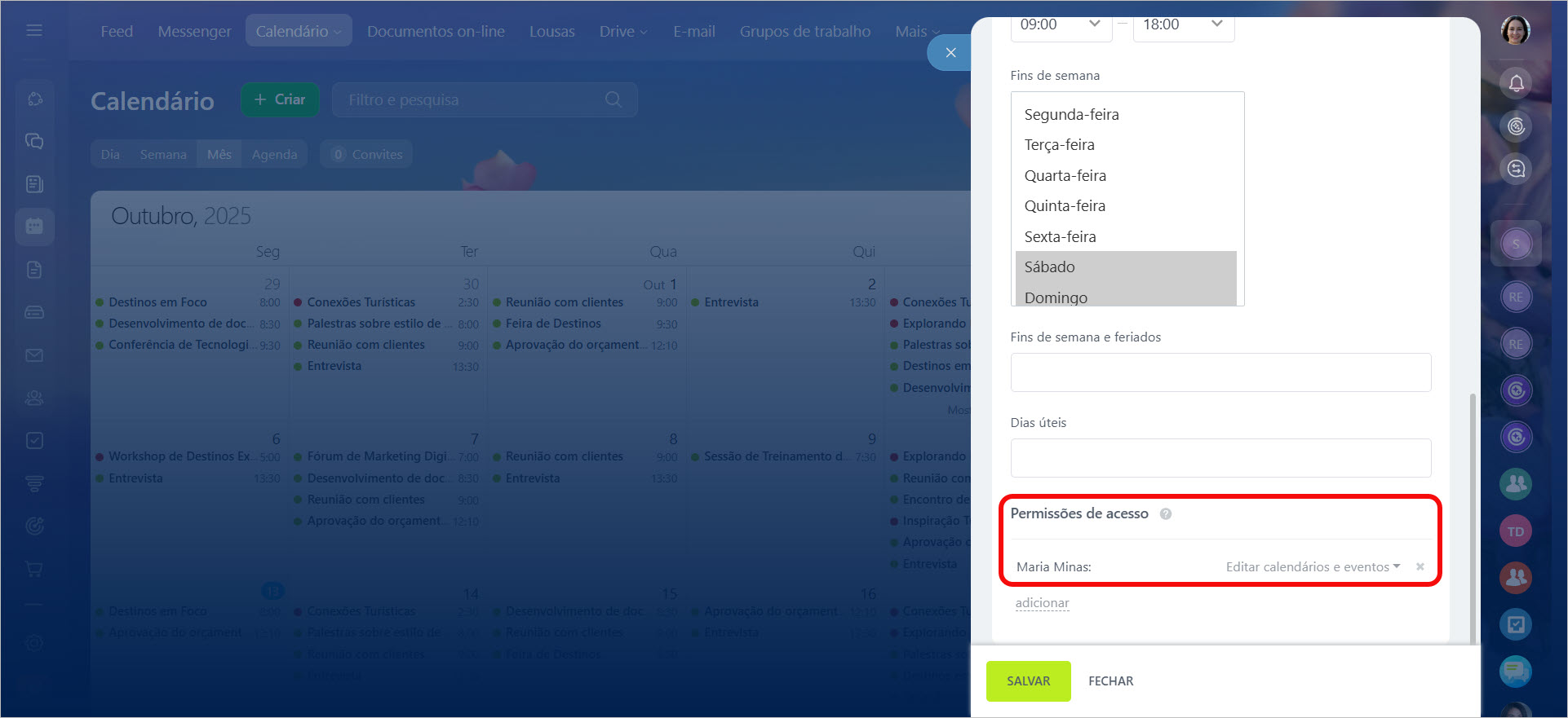 As permissões das seções têm prioridade sobre as permissões dos calendários individuais: se o administrador bloquear o acesso à seção "Meu calendário", os colaboradores não poderão acessar os calendários pessoais.