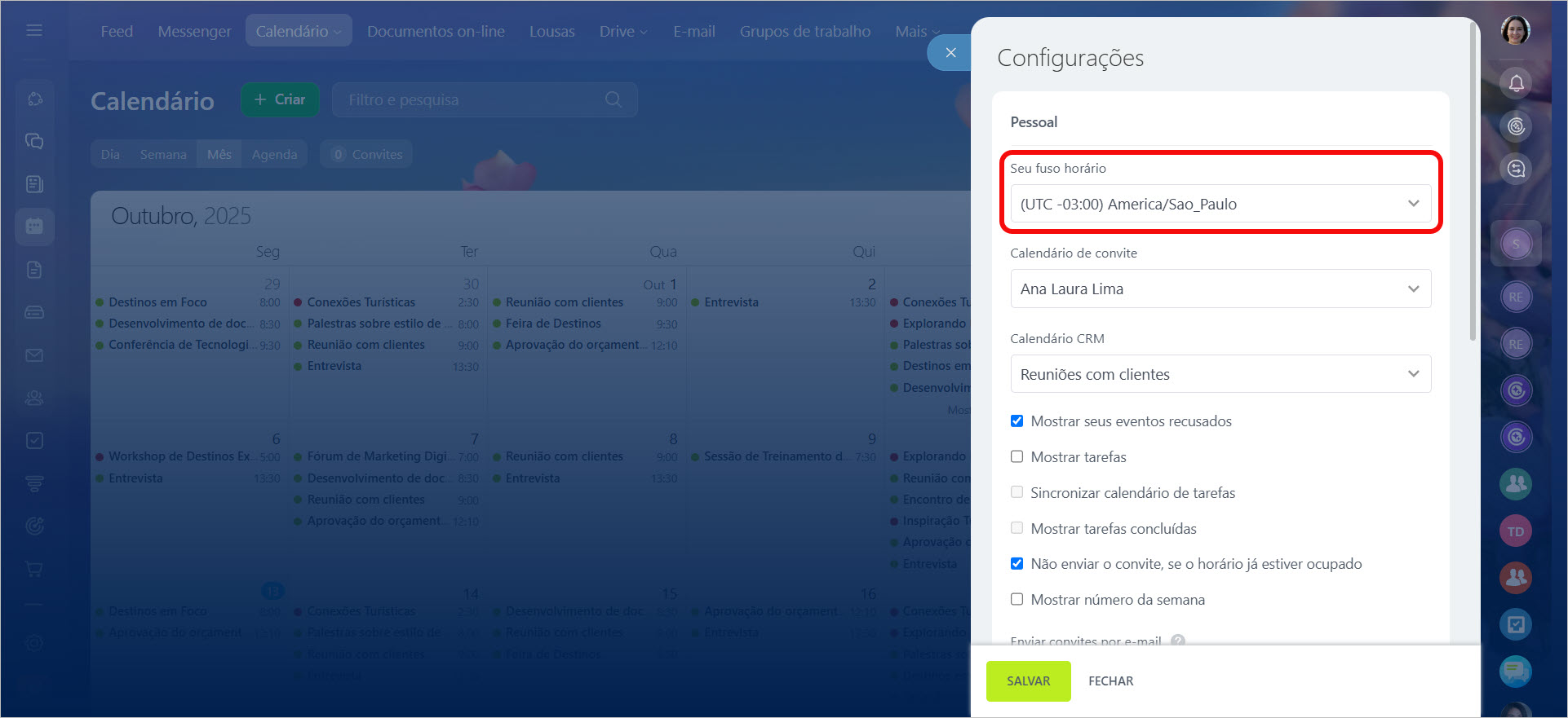 O calendário do Bitrix24 ajusta automaticamente o horário de acordo com o fuso horário do colaborador. Se uma reunião for marcada para 12:00 em Manaus, ela será exibida como 13:00 para um colega em Brasília e 11:00 em Rio Branco. Cada pessoa vê o evento no seu horário local — sem necessidade de conversões manuais.