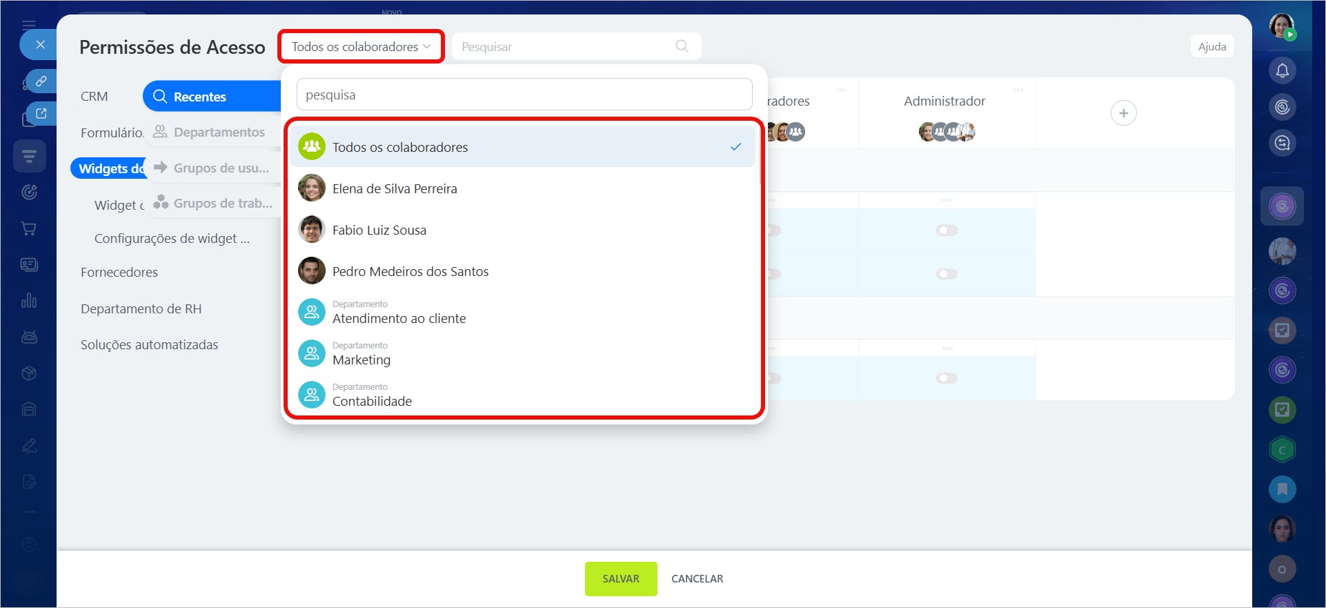 No Bitrix24, agora você pode ajustar as permissões de acesso para os widgets do CRM. Isso permite decidir quem pode ver, criar e modificar os widgets.