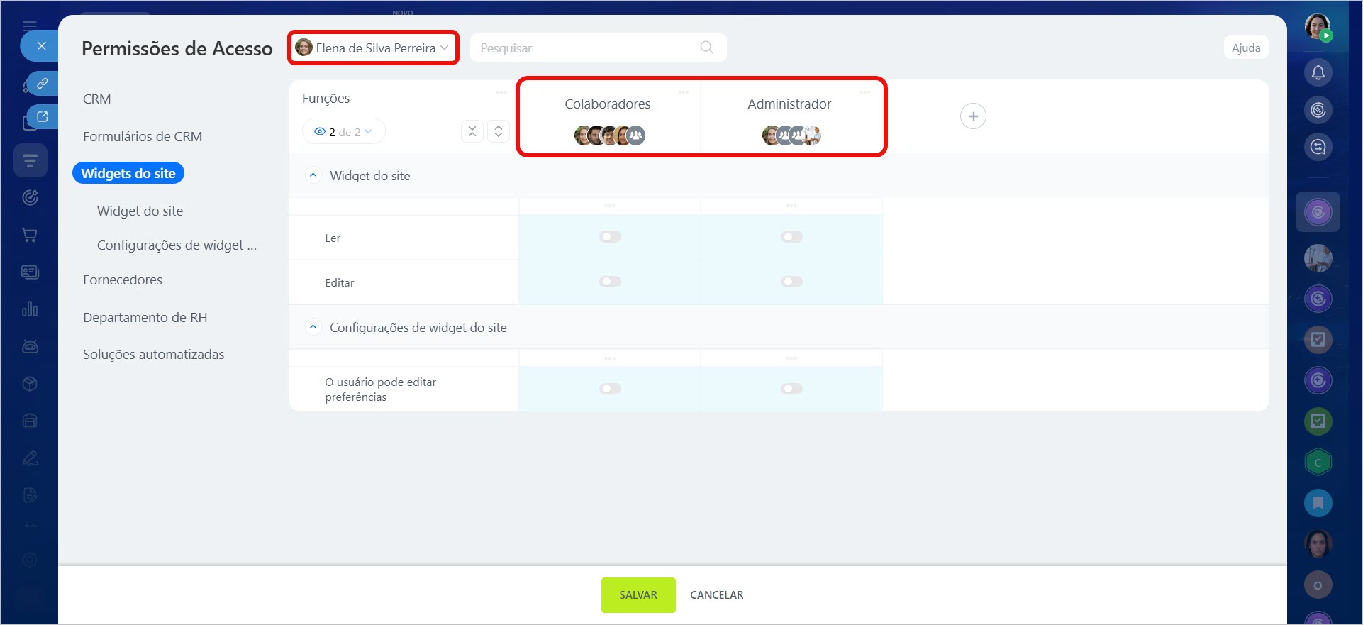 - Se funções adicionais foram criadas nas configurações de permissões do CRM, elas serão transferidas automaticamente para as permissões dos widgets.