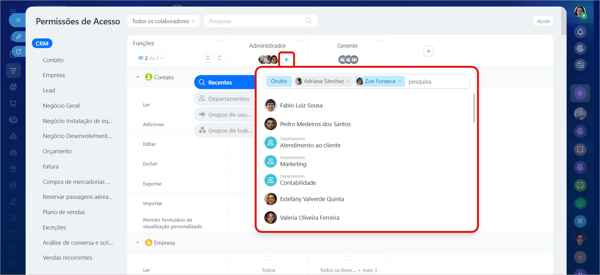 - As permissões de acesso baseadas em funções permitem estabelecer permissões específicas na seção de CRM. Você pode criar funções com diferentes níveis de acesso para departamentos e funcionários.