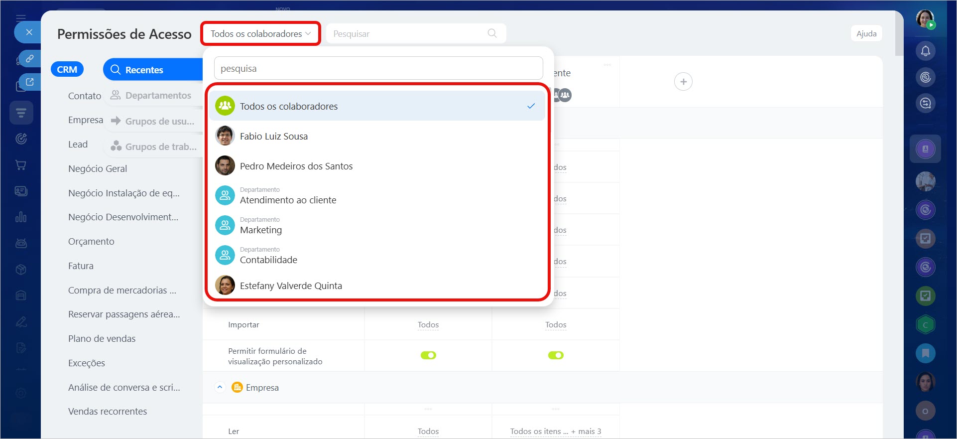 Vá para a seção CRM > Configurações > Permissõess de acesso ao CRM.