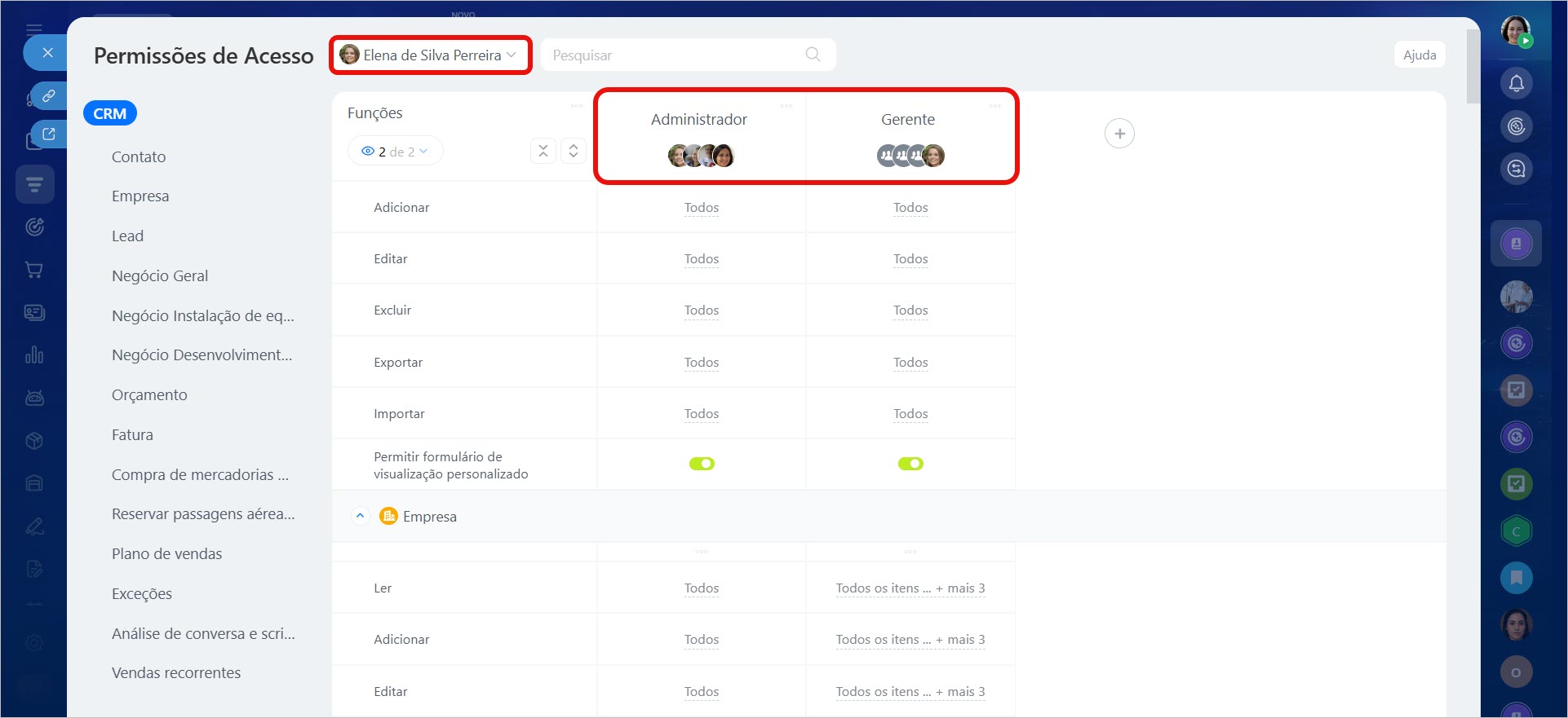 - Selecionar todas as permissões: concede acesso completo a todos os elementos do CRM para a função selecionada.