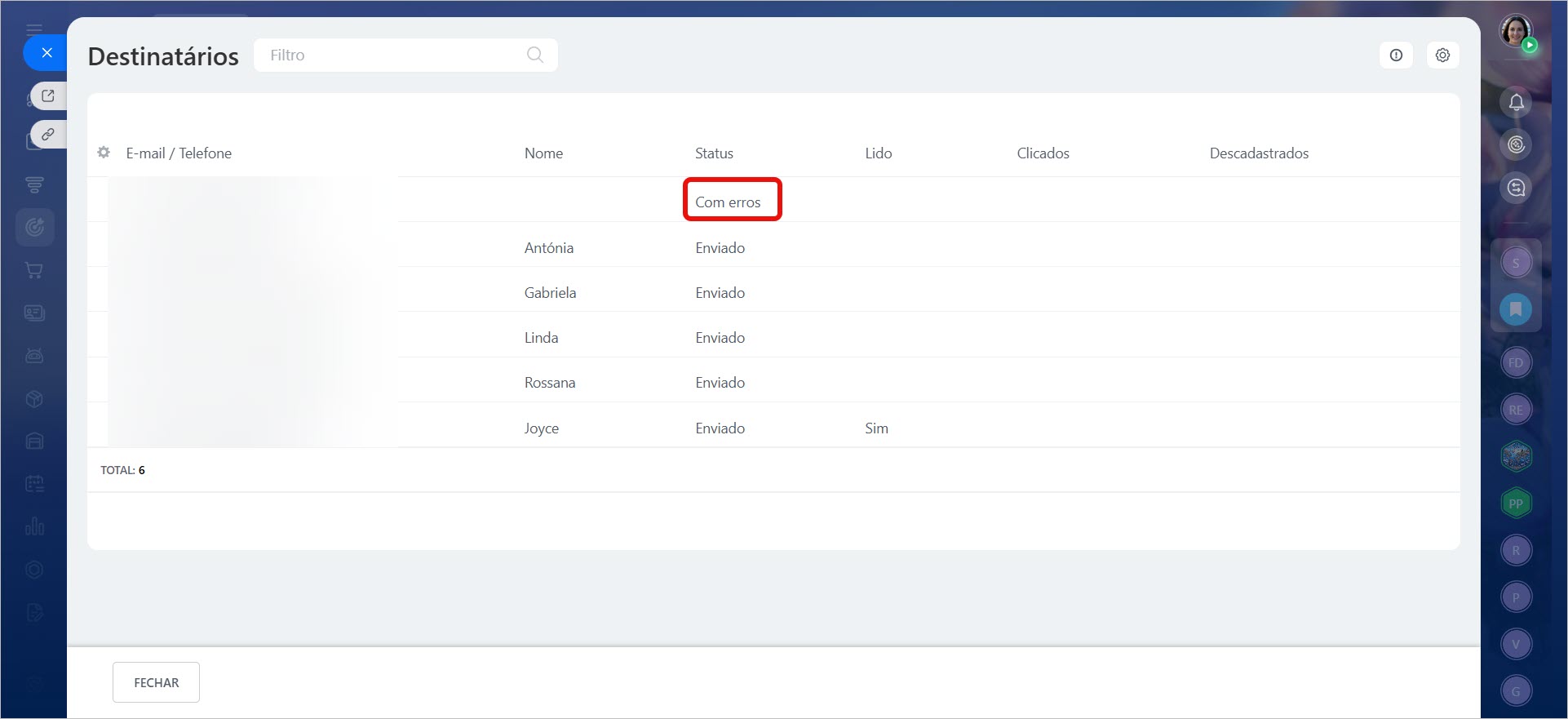 Problema: Os e-mails da campanha estão marcados com o status "Com erros" e não são entregues aos destinatários.