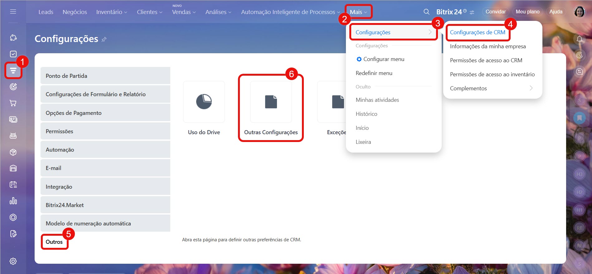1–3. Acesse Mais > Configurações > Configurações de CRM.
