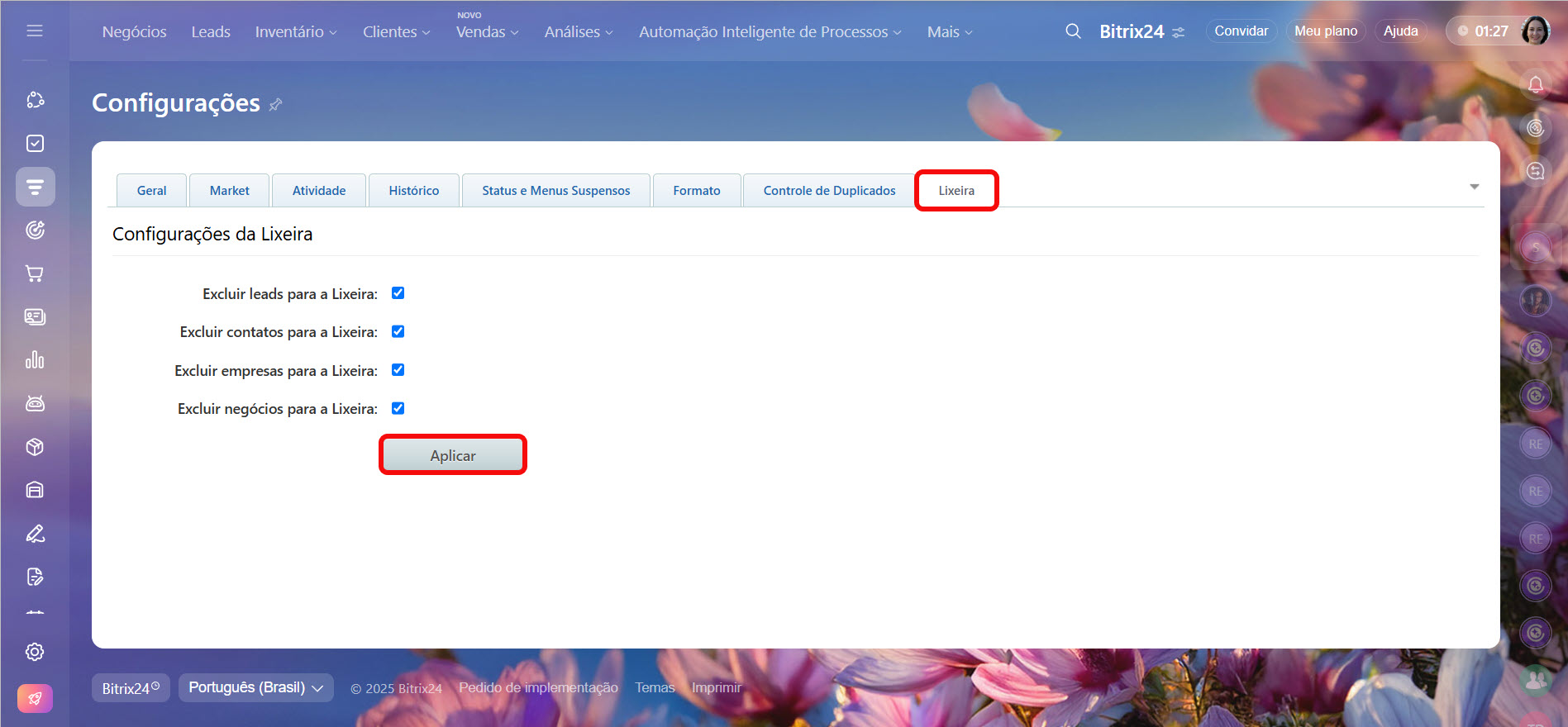Se necessário, é possível desativar a lixeira para alguns itens do CRM: