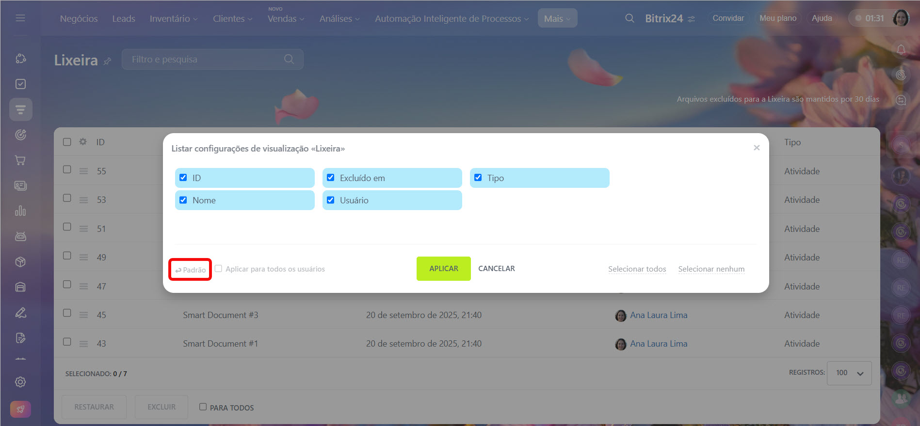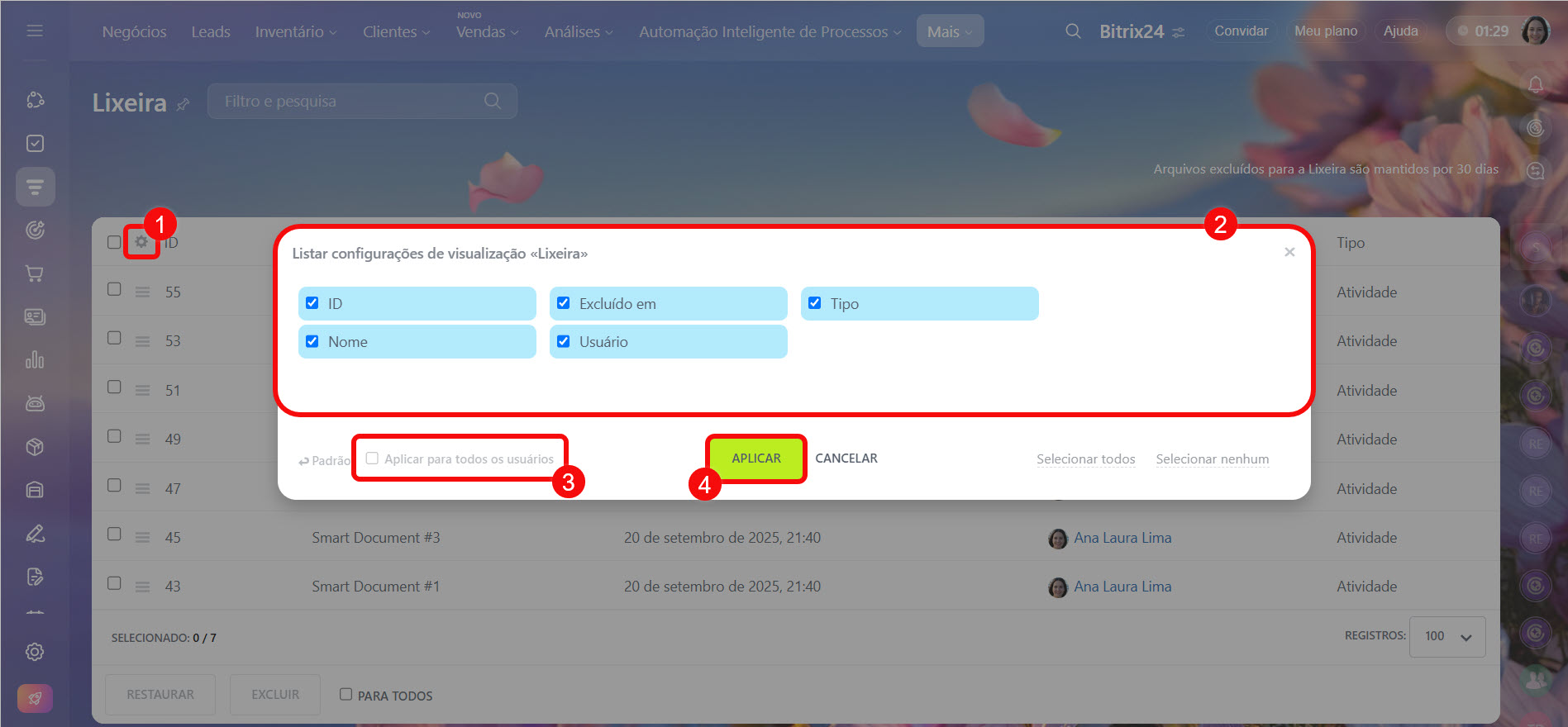 - Para encontrar rapidamente os itens necessários na lixeira, escolha quais campos exibir na lista e configure os filtros.
